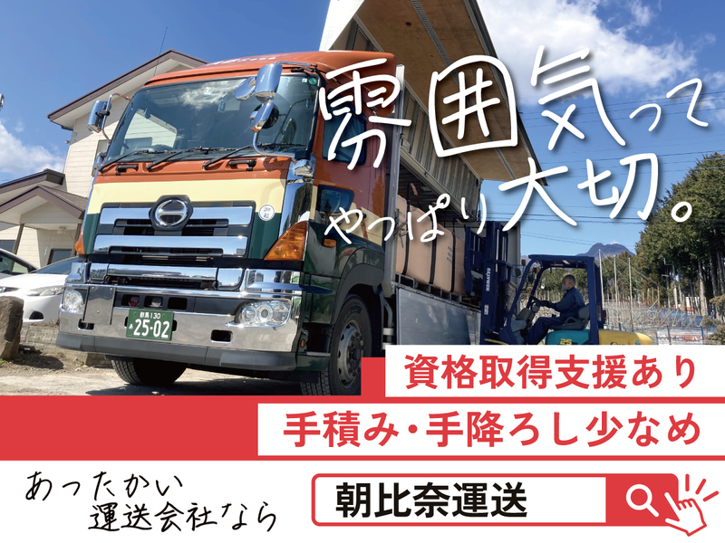 仕事内容 ========================= <<休みも、待遇も、職場環境も良好!>> 群馬や関東近郊の配送だから、続けやすく、 働きやすい。《働きやすさ抜群》 土日祝休み/賞与/年休110日《待遇充実》 ========================= 【お仕事内容】 大型ドライバーのお仕事をお任せします! <運送地域> 群馬県内や関東近郊、一部中長距離含む。 ー ***【 ここが当社で働くPOINT 】*** ー 1)<未経験者大歓迎> 経験ゼロで始めたドライバ―がたくさん。 まずは同乗からスタートします! 未経験から始める不安をよく知っている 先輩ばかりだから研修は丁寧に実施! 気さくに声を掛けてくれる先輩ばかりです! 10年以上と長く活躍するスタッフもおり、 居心地の良い職場環境も当社の自慢です。 例‥渋川~関東地区全域 渋川~東北方面(福島県・宮城県一部等) 渋川~東海・関西方面(一部等) 2)<働きやすさを重視!> 覚えてしまえば難しい仕事ではありません! ・手積み・手降ろしが少なく、体への負担は 少なめ。 ・「休みは固定がいい」「家族との時間を持ち たい」など、ON・OFFどちらも大切にして 働くスタッフ多数活躍中! ・女性ドライバーから「働きやすい」との声も いただいています! 【社員インタビュー*こんな職場です!】 個性豊かなスタッフばかり! 職場にはユーモアたっぷりなドライバーが たくさんいます(笑) 仕事以外の相談も乗ってくれる社長、 ドライバーを陰ながら支えてくれる内勤。 先輩のサポートもあって、ほんとうに 「あったかい」職場です。 私も未経験スタートですが、一度覚えれば そんな難しくないので意外と大丈夫でした! 長く働ける環境で離職率も低いですし、 未経験入社から会社の中核を担うスタッフも たくさん活躍しています! (スタッフより) ー【朝比奈運送について】ー 群馬県内を中心に化成品・LPガス、雑貨から 土木資材まで様々なモノを運送しています。 地域密着型の運送会社として様々なニーズに 柔軟に対応し、地元に貢献しています。 【HP】https://www.asahinaunso.jp/