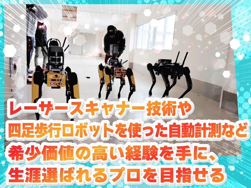 求めている人材 【必須条件】 高卒以上 ※大卒の方は条件が異なります。 月給26万6420円~ ――― ■業界未経験者歓迎 ■基本的なPCスキル必須 ※ExcelやWordに滞りなく文字入力が出来ること ※タッチタイピングやExcel関数、プログラミングなどの技術は入社時に不要です。 業界未経験の方を歓迎します。 まずは先輩社員と一緒に現場に入り、 測量の基本から丁寧にお教えします。 慣れてきたら、3Dレーザースキャナーやドローン、 4足歩行ロボット(Spot)など、 最新の計測技術にも携われます。 資格は入社後に取得していただければ大丈夫です。 希望者には通信教育の受講補助制度があり、 会社として「測量士補」「測量士」「土木施工管理技士」などの 資格取得をしっかり支援します。 資格取得後は資格手当も支給され、 努力がしっかりと評価される環境です。 ミリ単位の精度を求められる測量業務だからこそ、 丁寧な作業や確認を大切にできる方を歓迎します。 正確さと探求心を持って取り組める方をお待ちしています。 【こんな方に向いています】 ・手に職をつけたい方 ・新しい技術や機材に興味がある方 ・コツコツと作業するのが得意な方 ・ドローンやロボットなど機械が好きな方 ・チームで協力しながら成長していきたい方 年齢の条件と理由:あり(例外事由3号のイ・39歳以下(長期勤続によるキャリア形成のため))