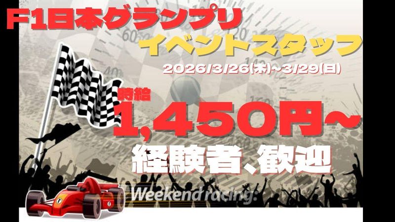 仕事内容 ◆◇◆◇◆◇◆◇◆◇◆◇◆◇◆◇◆◇◆◇ 2026年3月開催! 鈴鹿サーキット F1日本グランプリ! ◆◇◆◇◆◇◆◇◆◇◆◇◆◇◆◇◆◇◆◇ 毎年大人気のお仕事です! サーキット内での グッズ販売スタッフ募集開始! 就業2日~OK! 土日のみ、平日のみもOK! 空いているお日にちだけでもご就業可能! ◆◇◆◇◆◇◆◇◆◇◆◇◆◇◆◇◆◇◆◇ 【販売】 ■2026/3/26(木)~3/29(日) 8:00~18:00(休憩2h) ※時間は前後しますのでご了承ください。 ※金土日は7:30~19:30の可能性あり。 ★上記日程でご参加可能な日のみOK★ 特に3/26(木)、3/27(金)にご就業いただける方、 積極採用中! 〈お仕事内容〉 ・接客販売 ・レジ対応 ・在庫補充 ・商品整理 など・・ ◎制服貸出しあり! ◎髪色、ネイル、ピアス自由! Tシャツやタオル、キャップなどF1チームのグッズを販売! お客様へお声掛けや試着の提案を行い、 簡単なレジを担当♪ レジ経験の無い方でも すぐ慣れることができますよ(^^♪ 会場内は多くのお客様で大賑わい♪ 海外の方もたくさんご来場されますので、 外国語が得意な方大歓迎! ◆◇◆◇◆◇◆◇◆◇◆◇◆◇◆◇◆◇◆◇ ≪同時募集中≫ 【設営】※設営日のみの募集はありません ■3/22(日)~3/25(水) 9:00~18:00(休憩1h) 〈お仕事内容〉 ・商品の荷下ろし ・商品陳列 ・ディスプレイ作成 ・商品値付け など。 設営日のご参加も同時募集中!