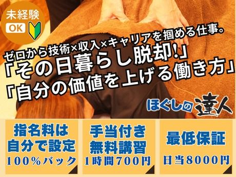 仕事内容 未経験OK|駅前0分!週3日~×手当付き講習|WワークOK|最低保証8,000円で安心 \未経験から“手に職”をつけたい方へ/ 午後スタート&無料講習つきで、安心して始められる環境です! ■【この求人のポイント】 ================================ ・14:00~23:30の間で《1日5h~》OK ・未経験・ブランク歓迎(20~50代が活躍中) ・マンツーマン研修&無料講習あり(1hごとに手当700円) ・指名料100%バック(料金は自分で設定OK) ・最低保証日給8,000円で、業務委託でも安心スタート ・午後スタートでWワーク・家庭との両立がしやすい ・落ち着いた雰囲気で定着率◎(勤続10年以上も在籍) ■【仕事内容】 ================================ 「ほぐしの達人 成増店」にて、 全身ほぐし・もみほぐしを中心とした リラクゼーション施術を行うお仕事です。(未経験OK) まずは ベッドメイクなどの簡単な作業からスタート。 施術は、できることから少しずつ丁寧にお教えします! ◆具体的には◆ ・お客様の体調・お悩みのヒアリング ・全身ほぐし・指圧・もみほぐしなどの施術 ・肩・腰・脚など部位に合わせたハンドテクニック ・受付、ご案内、ベッドメイクなどの店内業務 ・アロマオイルメニュー(できる方から少しずつ) ◆施術数の目安◆ 平日:4~6件/土日:6~8件 ※デビュー直後は【1日4件】から無理なくスタートできます。 働き方の特徴 \未経験でもムリなく続けられる働き方/ ・しっかり稼げる、駅前0分の好立地 ・午前中は家事・趣味・学校など自由に使える ・《週3~/1日5h~》なので無理なく働ける ・休憩中の一時帰宅OK(近隣スタッフに大好評) ・Wワーク・副業・家庭との両立も安心 ・働くペースはあなたに合わせて調整します 未経験でも安心の研修制度・無料講習(手当700円/1h) 未経験スタートのスタッフが多く、 ゼロから技術が身につく安心のサポート体制 が整っています。 「できるかな…」「難しそう…」という不安があっても大丈夫。 当店では “できるまで丁寧に教える” ことを大切にしています。 ◆ 研修・サポート内容 ・マンツーマンで、姿勢・手技・接客まで基礎から丁寧に指導 ・実践も先輩が横について優しくフォロー ・デビュー後は予約数を調整し、あなたのペースで成長OK ・整体・リラクゼーションの知識も働きながら習得可能 ◆ 無料技術講習(1hごとに手当700円支給) ・講習費は完全無料 ・受講中は1hごとに700円の手当が出るから安心 未経験から「一生ものの技術」が身につく環境です。 〈学べるスキル〉 ・全身ほぐし/指圧/もみほぐしの技術 ・お客様の悩みに寄り添うコミュニケーション力 ・日常生活にも役立つ身体の知識 業務委託の働き方について 「業務委託って難しそう…」 そんな未経験の方でも安心して始められる仕組みがあります。 実はとてもシンプルで、 “フリーランスの自由さ × 最低保証の安心” を兼ね備えた働き方です。 ◆ メリット ・働く時間/日数を自分で決められる ・ノルマ・シフト強制なし ・好きな日にお休みOK ・施術件数に応じて収入UP ・指名料は100%あなたの収入に! ◆ 安心ポイント ・日給8,000円の最低保証あり ・午後は入客が安定し、未経験でも稼ぎやすい → 「業務委託が初めて」の方でも安心してスタートできます。 【応募を迷っている方へ】未経験でも安心して始められます 未経験の方でも、安心して始められる研修体制があります。 働き方や収入の仕組みも、面談で丁寧にご説明しますので、 “話だけ聞いてみたい” という応募でもOK! 少しでも気になった方は、ぜひお気軽にご応募ください。 ● 働きやすさ(Q&A) ・14時スタートで生活リズムが整いやすい ・施術の合間に10分インターバルあり ・主婦・Wワーカー・フリーターなど様々な方が活躍 ・未経験は“1日4件”から無理なくスタート可能 ● 30代・子育てママ 「基礎から丁寧に教えてくれるので安心でした。家族に喜ばれる技術が身につきます!」 ● 30代・未経験からの挑戦 「手に職をつけたくて応募。マンツーマンで教えてもらえるので自信がつきました。」