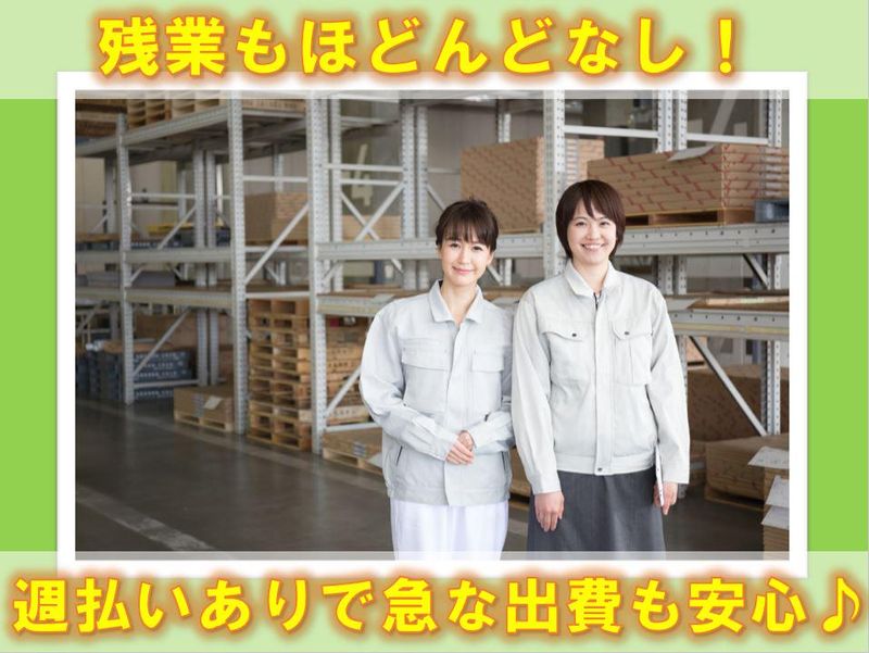 仕事内容 ★キャンペーン時給1400円!週払いOK! ★未経験OK!土日休み! ★小さなアルミ製品を機械にセット・外し・箱詰のおしごと <かんたんなモクモク作業> 1人1台の機械に向かってのモクモク作業! 冷暖房完備でカイテキ 【お仕事内容】 入社したほとんどの方が未経験! 工程はシンプルなので安心です! 軽い部品を機械にセット・リセット 箱に入れるシンプル作業 集中してお仕事したい方にピッタリ! ★職場にフリードリンク有 ★仕出し弁当360円で購入可能! ⏩組立・検品・梱包などの 軽作業経験がある方は 即戦力として活躍できます。 働くスタッフからは 「冷暖房完備なので暑い、寒いが なくてモチベーション上がります!」 「モクモク仕事なので時間が経つのが早いので助かります♪」 といった声が多数寄せられています。 清潔で明るい職場で一緒に働きましょう! ⏩平日のみ勤務♪充実した土日休み★ 週末はお休みなので、 プライベートの予定も立てやすく、 家族と過ごす時間や 自分の時間を大切にしながら働けます◎ 仕事とプライベートのバランス を保てるので、 長く楽しく働くことが可能です♪ 残業は基本的にありません! ほぼ時間通りに帰れます。 ⏩基本一人での作業となりますので 集中して進められます。 未経験から自分の生活を 大事にしながら働ける会社です! 弊社スタッフによる丁寧な サポートもバッチリ◎ 働く中で疑問や不安なことがあれば その都度相談できる環境も整えています! 初めてのお仕事は誰でも 不安がありますよね。 どんなことでもご相談ください! 今働いている未経験スタートの スタッフも様々な不安がありました。 久しぶりの仕事復帰で ちゃんと仕事ができるか… 年も年なので体力的に大丈夫か… 仕事で使用する道具は難しいものなのか… その不安、一緒に解決していきましょう! それぞれの悩みがあって、 それぞれの働き方があります! あなたの働きやすい働き方を 一緒に考えていきましょう!