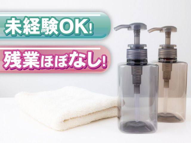 シャンプーボトルの検品やシール貼り作業/40代の男女活躍中/長期安定!カンタン軽作業!残業ほぼなし!