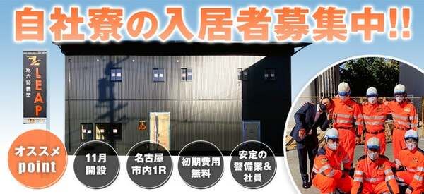 キャッチコピー ★家具家電付きの新築寮が2023年11月に完成しました!!★ 今なら7人分の空き部屋があります♪できたばかりのピカピカの寮に入居できるレア求人です! アピールポイント 県外からの応募もOK◎仕事と名古屋の暮らしを同時に手に入れたい方歓迎します! 部屋数に限りがあるので寮希望の方はお早めにご連絡ください!!! 雇用形態 正社員 掲載企業名 株式会社LEAP 応募受付先電話番号 052-737-3660 社名の由来は「飛躍」。あなたらしく飛躍できる環境です。 事業計画に基づいて雇用人数の定員を決めています。 規定の人数で仕事を行っていくことで、一人ひとりの給与のベースアップを行い、健全経営を実現していきます。 また、弊社では会社を大きくすることが企業幸福ではないと考えており、労働者幸福を第一にしています! 会社名でもあるLEAPは飛躍という意味を持っており、全ての従業員が現状より少しでも飛躍した人生を送れるような環境をご用意しております! \こんな方にもオススメ/ 交通警備・ビル管理・誘導警備の経験がある方 イベント催事場や施設・商業施設・ショッピングモールでの警備の経験がある方 誘導棒や誘導灯を使用したお仕事の経験がある方 \こんな資格・スキル・免許が活かせます/ 警備2級・警備1級、交通誘導警備検定、指導教育責任者 企業情報(備考) 企業名:株式会社LEAP