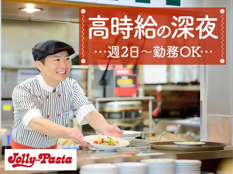 仕事内容 <パスタ専門店のジョリーパスタ!> **深夜スタッフ募集** 夜型さんにピッタリ♪ 高時給で効率良く働ける時間帯! 夜の時間を活用しませんか★ 定番から創作まで、おいしくて 種類豊富なメニューが人気の イタリアンレストラン! 【週2日~OK!】 ……………………………………………… スタッフの特権!全メニューの中から 半額で食べられる食事補助付き! 季節限定メニューもお得に楽しめます! ……………………………………………… 【仕事内容】 ◆パスタなどの調理 ◆調理補助・盛り付け ◆洗い場作業 など キッチン・調理スタッフ未経験の方や、 ファミレス、飲食店、レストランや カフェスタッフなどが未経験の方でも 始めやすいお店です! ~未経験も安心のpoint~ *できることからお任せします!* ジョリーパスタで働くスタッフの ほとんどが未経験スタート。 しっかり整備されたマニュアルを 使いながら、簡単なことから教えます! …ジョリーパスタは全国に店舗展開中!… 注文を受けてから茹で上げる本格パスタや、 手づくりピッツァをリーズナブルな価格で 提供する[ジョリーパスタ]。 季節ごとの新メニューの登場は いつもワクワクしちゃいますよ♪ …こんな方大歓迎!… ・アルバイトが初めての方 ・スキマ時間で働きたい方 ・オシャレな雰囲気が好きな方 ・パスタやイタリア料理が好きな方 ・ファミリーレストランで働きたい方