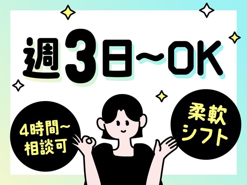 変形労働時間制 勤務時間詳細 1ヶ月単位の変形労働時間制 1週間あたりの平均労働時間:40時間 8:45~20:00の中でのシフト勤務 週3日から、1日3時間からなど 柔軟に対応いたします! ※週12時間以上の勤務をお願いしております 面接時にご相談ください♪ 業務開始~15分間 朝礼・周知あり