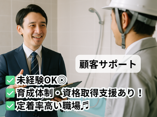 仕事内容 \自社開発のFRP防水材『ポリルーフ』/ □浴室リニューアル工事の営業(新規開拓含む) □職人への指示出し・工事進捗管理 □現場見積・書類作成 FRP防水材国内トップシェア企業で、浴室リニューアルの提案~現場管理までお任せします。 【雇用形態】正社員 【給与】年収:400万円~600万円(未経験:360万円〜) 【勤務時間】9:00〜17:30 【勤務地】兵庫県神戸市兵庫区芦原通1丁目2番26号(公共交通機関のみ) 【募集要件】顧客折衝経験必須/営業経験歓迎/高卒以上 ★この求人のアピールポイント★ ◇国内トップシェアのFRP防水材メーカーで安定性抜群 ◇年間休日120日・土日祝休みでプライベートも充実 ◇不妊治療休暇・育児支援など制度が充実 ◇2年に1度の海外研修旅行(40年以上継続) ◇転勤なし・通勤しやすい三駅利用可能 ◇創業70年以上の安定企業 【どんな会社?】 創業1947年、FRP防水材「ポリルーフ」をはじめ、防水・防食分野で圧倒的存在感を誇るメ ーカー。屋上、浴室、プール、駐車場など多様なシーンで施工され、施工面積は15,000,000㎡以上。全国200社の代理店ネットワークがあり、製品力と技術力で信頼されている安定企業です。 【お仕事内容】 浴室リニューアル工事に関する営業+現場管理(施工管理)を担当します。 具体的には ■新規開拓営業 ■現場受注までの見積・交渉 ■受注後の現場訪問・書類作成 ■職人への指示出し・工法指導 ■工事のスケジュール管理 ■1日複数現場を巡回し進捗管理
