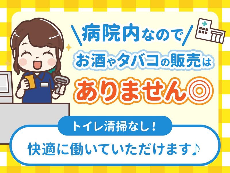 仕事内容 病院内の清潔な環境で、 活気のある売店業務に従事いただきます! <病院内なのでお酒・タバコの販売なし> <特別なスキル不要!未経験歓迎!> *病院内の快適な環境ですが、 体力を使う場面もあり、 20代・40代が活躍中です! *契約上限年齢:65歳 病院内でのお仕事なので、 清潔な環境で快適に働けます! トイレ清掃もありません。 また小さな店舗なので品数は少なめですが、 品出しなどで適度に体を動かすことが出来るため、 アクティブな方にぴったりです。 簡単なので、未経験はもちろん 初パートの方でも安心して働けます。 慣れれば自分のペースでできます! 【 仕事内容詳細 】 *レジ対応 *雑貨・食品の販売・品出し *商品の陳列 *発注作業・在庫管理など ※フライヤー業務、お酒タバコ販売、 トイレ清掃全てありません。 昼ピーク時以外はゆったり作業できます 【 1日の流れ例 】 6:30-13:45勤務の場合 06:30 オープン準備 品出し・検品・レジ点検など 07:30 レジ・接客メイン! 合間に商品の発注や補充作業 12:00 レジ点検(売上金額の確認) 13:45 終了 ※シフト制です。通し勤務ではありません。 <日勤のみのお仕事!> 無理のない勤務条件で 腰を据えて働いていきませんか? 未経験歓迎!丁寧に指導します! 経験や資格は一切不問、長く働きたい方大歓迎 業界・職種ともに完全に未経験でも大丈夫です!