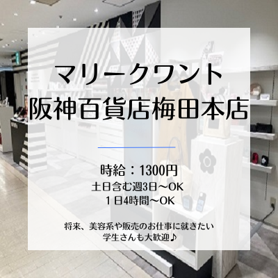 仕事内容 ⭐マリークワント・ショップでの化粧品・アパレル雑貨の販売⭐ コスメやファッション・アクセサリーなどの 多彩な商品をお客様にご案内するお仕事です。 ≪具体的には…≫ ⏩お客様へコスメ、ファッション商品のご提案 ⏩店舗のレイアウト変更 ⏩商品や備品の補充 ⏩店舗の清掃 etc. タッチアップの業務はないので 未経験の方でも安心してお仕事できます。 \こんな方にオススメ/ 学生・フリーターなど20~30代中心に活躍中!! 将来、美容系や販売のお仕事に就きたい 学生さんも大歓迎♪ 募集職種:アルバイト