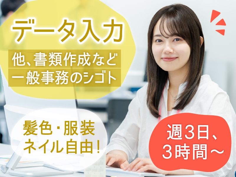 仕事内容: ✨毎日出勤出来る方大歓迎✨ データ入力・書類作成メインのシゴト! サービスに関する問い合わせ対応は コールセンターにお任せ♪ ------------------- ✅土日祝はお休みです! ✅16時まで出来る方急募! ✅週3日、1日3時間からOK! ⭐髪色・服装自由! ⭐ネイルOK! ✨正社員登用制度あり! ------------------- 住宅建築に必要不可欠な 「養生(ようじょう)資材」を扱う企業の 本社オフィスでのお仕事です。 一般事務スタッフ パソコン入力・書類作成や 電話応対など、一般事務のお仕事です。 外部からの問い合わせは コールセンターのスタッフが担当 するので、事務業務に専念して いただけますよ。 PCでの入力業務がメインです。 ブラインドタッチスキルは必須ですが、 難しい表計算などはできなくてもOK! ☆未経験者歓迎!丁寧にレクチャーします。 ☆能力に応じて、給与アップ♪ 先輩スタッフと一緒にお仕事します。 分からないことがあっても スグに聞けて安心! 事務が初めての方も大歓迎です★