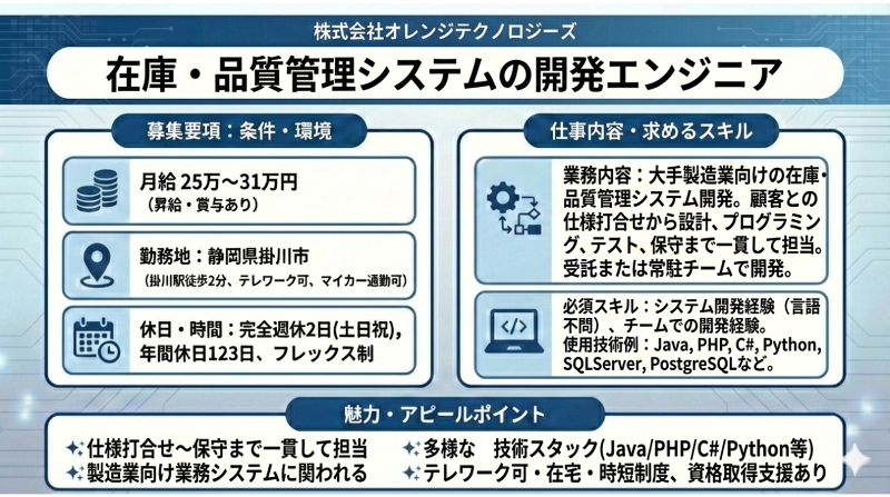 仕事内容: ■業務概要 大手製造業向けの在庫管理・品質管理システムに関わる開発業務を担当します。顧客との仕様打合せから設計、プログラミング、テスト、保守まで一貫して携わり、業務の効率化と品質向上を支えます。 ■対象 ・在庫管理システム、品質検査システム ■業務内容 ・在庫管理/品質検査システムの設計・開発 ・顧客との仕様調整およびレビュー対応 ・テスト設計・実施、保守運用 (経験やスキルによって以下の業務も従事の可能性あり) ・データ連携ツール開発 ・他業務システムとの連携アプリ開発 ■環境 ・言語:Java、PHP、JavaScript、VC++、C#、Python ・OS:Windows、Linux ・データベース:SQLServer、PostgreSQL ・IDE/エディタ:Visual Studio、Eclipse ■体制 ・社内受託チームまたは常駐チーム(3~6名規模) ・顧客との密な連携が求められる現場中心の開発体制
