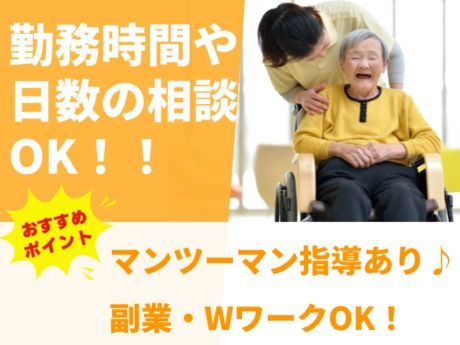 仕事内容 \ここがポイント/ ◎勤務時間・日数は調整可能! まずはご相談ください! ◎ブランクがある方・未経験の方でもOK! 入社後はマンツーマンで教えるので 安心して働けます。 ◎高時給1250円! *・。・。*・。・。*・。・。* <仕事内容> 【介護老人保健施設にて介護】 身体介助・食事介助・排泄介助 入浴介助・オムツ交換・記録業務・清掃など ※就業後、業務内容の変更はありません。 *・。・。*・。・。*・。・。*