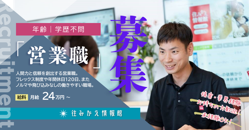 仕事内容 「接客は好きだけど営業ができるか不安」 「今の仕事はノルマがキツイ。。」 「仕事に追われて私生活が物足りない」 そんな悩みがある方、ご覧になってください! 反響営業&ノルマなし&年休120日 ワークライフバラスを考えた アットホームな環境であなたをお待ちしてます♪ \\☆ここがアピールポイント☆// ⭐ノルマなし◎明るい雰囲気の職場 ⭐ほぼ反響営業!飛び込み一切なし◎ ⭐年間休日120日!週休二日制! ⭐フレックス制で働きやすさ抜群! ⭐頑張りはしっかり還元◎ ⭐未経験者歓迎!安心のサポート体制 【今回の募集理由】 ─────────── 事務所を建て替えた影響で 仕事量増加のため増員募集! 未経験でも意欲があればOK! ともに励み切磋琢磨する方を歓迎します! お気軽にまずはご応募ください♪ 【お仕事内容】 ─────────── ✅物件の紹介・ご案内 ✅入居前のお部屋チェック ✅HPに載せる物件の写真撮影 ✅退去後の原状回復確認 ✅敷金の清算業務 ✅契約書の準備 【サポート体制】 ─────────── ①先輩との物件同行 どんな物件があるかを知ろう! ↓ ②情報の操作や見方を学ぶ! 社内システムについて勉強! ↓ ➂3カ月目くらいで営業開始! 先輩も同行するので安心♪ 【1日の流れ(例)】 ─────────── 8:45~9:00|朝礼とOpen準備 9:00|物件の問い合わせやメール確認 9:30|お客様への物件紹介、案内 11:00|HPの情報の確認 12:00~13:00| お昼休憩 13:00|引渡し前のお部屋のチェック 14:00|契約書の作成 15:00|お客様への物件紹介、案内 17:00|契約書の作成 17:30~18:00|片付け&帰宅 【先輩社員にインタビュー♪】 ⭐ご結婚されている男性社員 ────────────── 紹介で当社を知り、応募しました。 就業時間が早いので、共働きの 自分たちにとっては子育てと両立が できてとても働きやすいです。 大型連休もあるので家族時間を 取れるところも嬉しいです。 ノルマは無いですが、現場のみんなで がんばる雰囲気があるので、自分が 売上に貢献できた時がうれしいです♪ ⭐同じ業界経験者の男性社員 ────────────── 同業界で勤めていましたが、外から見て この会社は長く働けそうだなーと思い 応募してみました。 社員同士で声がかけやすく、 社長との距離も近いので相談しやすいです! お部屋を紹介したお客様に喜んで いただけた時が一番うれしいですね! 【弊社について】 ─────────── 当社は不動産会社としては珍しく 『ノルマなし、上下関係なし』 でも強いパートナーシップ、 良好な人間関係、 風通しのよい社風があり、 信頼できる仲間と一緒に のびのびと働ける魅力があります! 人の幸せは、お金やキャリアを 手に入れるだけではなく、 どれだけ多くの人に愛され信頼されるか。 会社も同じです。 いかに多くの人に応援してもらえる企業であるか、 それが会社の価値だと考えます! そんな私たちと一緒に頑張れる方との 出会いを楽しみにしています♪