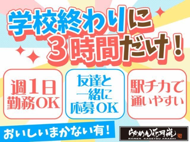 仕事情報 ● 仕事内容 【お友達と一緒に応募大歓迎◎】 ラーメン店にて、調理補助や簡単な盛り付け、片付け、 洗い物などキッチン業務をお任せします! まずは言われたことを丁寧に取り組んでいただければOK! ラーメンの調理ができるようしっかりお教えするので ご安心くださいね! 未経験でも安心! らあめん花月嵐、「麻辣日和」「芳香麻辣湯」といったラーメン店を日本全国で約250店舗を展開中の当社。 だからこそ、マニュアルも完備。 未経験の方でも安心して働ける環境です★ らあめん花月嵐のこだわり 看板商品「嵐げんこつらあめん」を筆頭に、 有名シェフ・ラーメン店主やタレントとコラボした 期間限定メニュー等を提供する次世代型ラーメン店! 店内はどこか懐かしく、でも他とちょっと違う雰囲気。 ラーメンを更ににおいしく食べられる工夫を散りばめています。 シフトは自己申告制! 自分の予定優先でOK!短時間勤務も相談に応じます♪ 学校のテストや、お休み中の旅行など、 自分の都合に合わせて働けるのもうれしいポイントです◎ メリット盛りだくさん! 幅広い世代のスタッフが活躍している当店。 月1回登場する新メニューもいち早く試食できます◎ ラーメン好きにはたまりません♪ 求人への応募が初めての方も大歓迎! 居心地の良さ抜群のお店で私たちと一緒にバイトしましょう!