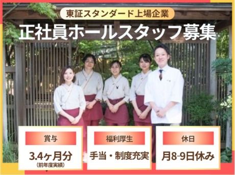 仕事内容 \梅の花で働く魅力/ ・賞与前年度実績3.4か月分 ・残業代は1分単位でしっかり支給! ・東証スタンダード上場企業で安定の待遇 ・月8~9日休み!連休も取得可能でワークライフバランス◎ ・地元で長く働きたい方も安心★転勤有無選択可能! ・各店舗正社員が2名以上在籍するようになっているので お休みが取りやすい状況を作っています! ▼お仕事詳細 ・受付、会計 ・配膳、接客、片付け ・客間の掃除 出社したら、予約表を確認し開店準備! 開店後は、受付担当、配膳担当に分かれます ▼安定した企業だからこそ安心の福利厚生 育児休暇・介護休暇、子ども手当や企業年金、 従業員割引制度など、待遇・福利厚生も充実させています。 長く安心して働いていける環境が整っています。 ▼未経験からでも将来的にキャリアが積めます 店舗スタッフ⇒主任⇒店長⇒支配人と 明確なキャリアパスを用意しており 昇格した後は、複数店舗をまとめる エリアマネージャーへの道もあり 多彩なキャリアを描くことができます。 また、ご家庭の事情や地元で長く働きたい という方もご安心ください! 通勤可能店舗のみの地元採用も積極的に実施しております。 ★かにしげはどんなお店? ▼梅の花の原点 蟹料理専門店で、本物のおもてなしを 「梅の花」のおもてなしの心が生まれた場所、 それが本格蟹料理専門店の「かにしげ」です。 ▼落ち着いた空間で、自分らしく働く 店内はいつも和やかで、落ち着いた雰囲気。 お客様一人ひとりに丁寧に向き合えるので バタバタしたお店が苦手な方にも最適です。