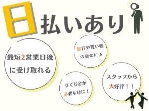 休日・休暇 ◆単発・短期 ◆シフト自由 ◆週1、2日からOK ◆月1からOK ◆長期希望の方もぜひ! 月に何日入らないといけないという規定はありません! 皆さんのスケジュールに合わせてお仕事をご案内させていただきます。