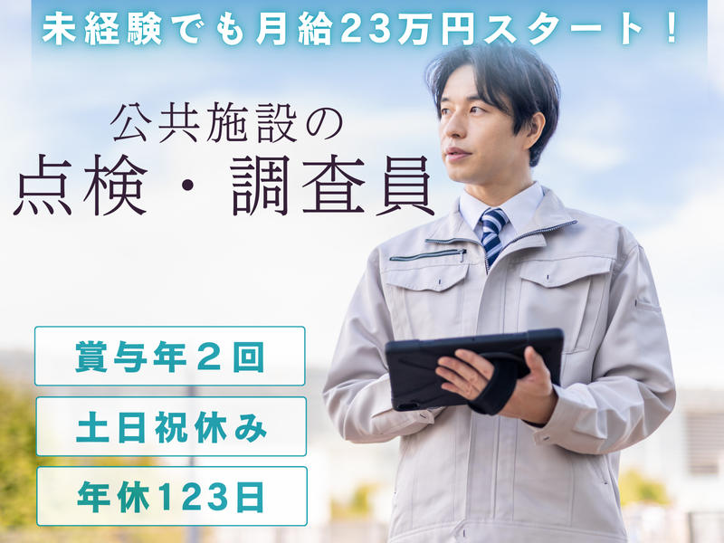 仕事内容 【未経験から安心スタート!】 公園の遊具や公共施設の点検・調査を お任せする、シンプルなお仕事です。 専門知識や経験は不要! 未経験の方でも安心して始められます◎ \安心して働けるポイント/ ✨完全週休2日制/年間休日123日 ✨年2回の賞与+業績に応じた手当あり ✨未経験でも月給23万円スタート! ⇒さらに昇給制度で頑張りをしっかり評価 ◆仕事内容はカンタン&ニーズ安定◆ 依頼元はほぼ100%が官公庁や自治体。 公園の遊具や公共施設を 調査・点検するのがメインのお仕事です。 ・危険な作業や体力勝負の業務は一切ナシ ・現場でのチェックは全体の3割程度 ・7割はデスクワーク!チェック結果をまとめ作業 無理なく働けるバランスの良さが魅力です◎ ◆教育体制もしっかり充実◆ 先輩がマンツーマンで仕事の流れを 丁寧に教えるため、未経験の方でも 安心してスタートできます◎ 最初は簡単なサポート業務から始め、 分からないことは気軽に 質問できる雰囲気です! 一人前になるまでに約2年かけて じっくり育成していくので、 確実に成長できる環境が整っています。 職場では男女スタッフが協力し合いながら、 和気あいあいと働いています♪ 繁忙期は1〜3月ですが、その分多くの経験を 一気に積めるチャンスの時期でもあります。 それ以外の期間は残業も少なく、 自分の時間を大切にできる働き方が可能◎ ◆当社について◆ 当社は設立から25年以上にわたり 建設コンサルティングを展開し、 自治体からの信頼を得て公共案件を 中心に安定した仕事を請け負っています。 「安定した環境で、安心して長く働きたい」 「未経験から正社員として挑戦したい」 そんなあなたを、当社は大歓迎します! 一緒に社会に役立つ仕事に チャレンジしませんか?