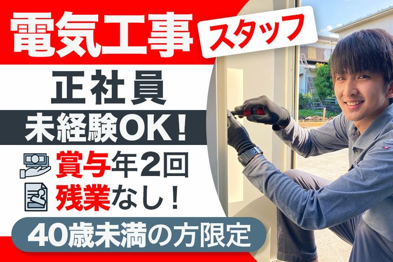 【アピールポイント】 \未経験OK!異業種からの転職者多数/ 公共施設の電気工事スタッフを正社員募集! ▼このような方が活躍しています▼ ✅数字ではなく、努力を評価されたい方 ✅手に職付けてスキルアップしたい方 ✅安定企業で腰を据えて働きたい方 ※40歳未満(例外事由3号のイ)限定※