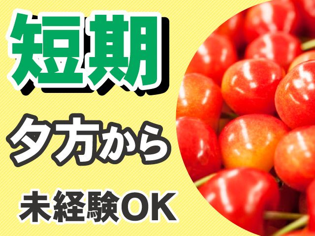 仕事内容 短期アルバイト募集中! 【期間】2026年6月初旬頃~2026年7月15日頃まで 夕方からの短時間ワーク! 青果市場にて、さくらんぼの荷分けのお仕事です。 簡単作業のため、お仕事ブランクがある方も安心です。 他、資材荷分けなどの作業もお願いします。 短期アルバイトをお探しの方はもちろん、 Wワークをお探しの方にもピッタリ! 旬のフルーツをお届けする仕事に携わってみませんか? <ポイント> ・未経験OK 特別な経験、資格は不要です。 ・夕方からのお仕事 ・幅広い年代が活用中の職場 学生さん、主婦(夫)、シニア(中高年)世代の方などが多数活躍中!