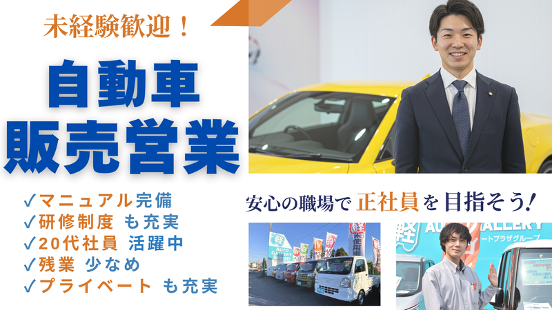 仕事内容 ✨第二新卒大歓迎✨ ✨未経験・正社員デビューも歓迎✨ 「人と話すのは好きだけど、 営業って難しそう…」 「厳しいノルマはイヤだな…」 「でも、そろそろ正社員で 安定して働きたい!」 私たちは、地域のお客様に愛される 温かい自動車販売店です。 未経験から営業職に安心して チャレンジできる環境で、 あなたの新しい一歩を応援します。 【ノルマなし!お客様と「話す」ことが大切な営業です】 当社の営業アシスタントは、 「売ること」だけを追求しません。 一番大切なのは、お客様との コミュニケーションです。 お客様が気持ちよく過ごせるように、 そして、楽しく車選びができるように、 あなたの明るい笑顔と会話でサポートします。 厳しいノルマは一切ありませんので、 プレッシャーを感じることはありません。 ✨未経験でもすぐできるお仕事内容✨ ✅お客様のご案内・受付 ご来店されたお客様を笑顔でお出迎え。 「いらっしゃいませ!」の挨拶や、 展示スペースへのご案内など、 お店の最初の窓口として活躍します。 ✅簡単なヒアリング・ご提案 お客様が「どんな車に興味があるか」 「どんなことに困っているか」を お伺いし、最適な車をご案内します。 難しい専門知識は不要です。 お客様の「買いたい」気持ちを 後押しするのが、あなたの役割です。 ✅書類準備・店内整備 お客様へお渡しする資料の準備や、 展示車の簡単な清掃・整理など、 お店を気持ちよく保つ業務も担当します。 お客様は、事前にネットやチラシで 車を選んでご来店される方がほとんど。 そのため、イチからニーズを掘り起こす必要はなく、 お客様に寄り添ってサポートする営業なので、 未経験の方でも安心して始められます✨ 【具体的なお仕事内容】 車の知識や正社員経験がなくても大丈夫! 入社後は、先輩が隣で一つずつ丁寧に 教えてくれます。 ご来店されたお客様の受付・ご案内 お客様への飲み物提供、簡単な雑談 お客様の希望に合った車の簡単なご紹介 電話応対(取り次ぎがメイン) 契約手続きの補助(書類の準備など) その他、営業スタッフのサポート業務 「人と話すのが好き」 「お客様に喜んでほしい」 「営業に挑戦してみたい」 そんなあなたにピッタリのポジションです! アピールポイント ✨20代中心!とにかく仲良しな職場✨ 当社のメンバーは、約7割が20代。 みんな未経験から中途入社なので、 「初めて」の気持ちを理解してくれます。 「人間関係で悩んだことがない」という声も多数。 困った時はすぐに助けてくれる、 家族のように温かい雰囲気です! ✨社会人としての第一歩を応援!スキルアップ支援✨ ✅イチから丁寧に指導! 外部の専門家による研修や、 先輩からのOJTで、 社会人としての基礎を学べます。 ✅ビジネスマナーも身につく! お客様対応を通じて、 自然と丁寧な言葉遣いや 立ち振る舞いが身につきます。 ✅資格取得も支援! 業務に必要な資格があれば、 会社が取得費用をサポートします。 ここで身につくのは、 車の知識だけではありません。 コミュニケーション力、 提案力、サポート力など、 どんな仕事でも役立つ力が磨けます。 ✨プライベート充実!無理なく働ける環境✨ 「仕事もプライベートも充実させたい!」 そんなあなたにぴったりの環境です。 ✅希望休が取りやすい! 事前に相談すれば、 連休や土日のお休みも可能です。 友達との予定も立てやすいです。 ✅残業少なめ! 無理な残業はほとんどありません。 定時で帰って、自分の時間を楽しめます。 ✅ノルマなし! 数字のプレッシャーがないので、 毎日笑顔で働けます。