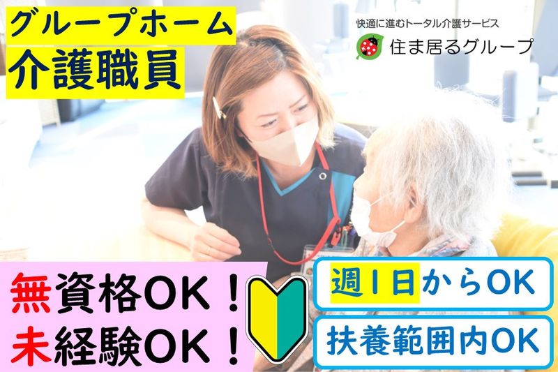 【仕事内容】 週1日・1日5時間から希望の働き方でOK!WワークもOK! 入居介護施設未経験の方も大歓迎!ブランクある方ももちろん大歓迎!20代~60代の男女活躍中! ■具体的なお仕事内容 定員18名のグループホームでの介護のお仕事です。 ・身体介護(見守り、移動介助) ・入浴(洗体補助、着脱補助) ・排泄介助 ・食事(配膳、下膳、見守り、食事介助) ・レクリエーション(実行、企画) ・記録物の記録 など ■こんな方にオススメ ・人間関係が良い会社で働きたい ・仕事もプライベートも充実させたい ・ご利用者様と一人一人向き合いたい ・将来性のある会社で活躍したい まずは、『詳しいお話を聞きたい』『会社・事業所・仕事の様子を見学したい』といったご希望もお気軽にご相談ください。 お問い合わせ・ご応募お待ちしております。