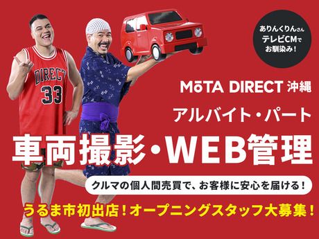 仕事内容 ◆【仕事概要・この求人のポイント】 自動車事業・買取事業・医療ローン事業 飲食事業など幅広く展開し多角経営で 成長を続けるフレックス。今回は ダイレクト事業部の展開する MOTA DIRECTうるま店の 車両撮影・WEB管理スタッフの募集です♪ *-*-*【ここが求人ポイント】*-*-* ■新規拠点・オープニングスタッフ ■写真を撮るのが好きな方 ■SNSで映える写真を撮るのが得意な方へ ■車をSNSにアップして反響を得るお仕事 ■特別な加工技術は一切不要です ■奇抜すぎなければ髪色ネイル自由 ■現在活躍中のスタッフ比率は女性90% ■家庭事情のシフト変更も許容できる職場 ■週2日の1日3h~勤務OK・フルタイム歓迎 ■土日勤務できる方も大歓迎 *-*-*-*-*-*-*-*-*-*-*-*-*-* 《今注目されているこんなサービスです》 ■【ビジネスモデル】 既存の中古車流通構造を簡素化し、 売り手と買い手の双方にメリットを もたらす次世代のサービスを展開中♪ 通常、車が次のオーナーに届くまでには 「買取店→オークション→販売店」と 複数の業者が介在し、その都度手数料が 上乗せされます。しかしこのビジネスは 中間マージンを全カット。その分を ユーザーに還元するため、売り手は高く売れ、 買い手は安く買えるWin-Winのサービス。 ■【こんな展開をしています】 「愛車を適正価格以上で売りたい」 「良質な車を安く手に入れたい」と願う ユーザー様へ限りなく個人間売買に近い 「直販形式」の中古車取引を提供♪ WEBを通じて買い手と売り手を マッチングさせる仕組みです。 *-*-*-*-*-*-*-*-*-*-*-*-*-* ◆【お仕事内容・詳細】 *-*-*-*-*-*-*-*-*-*-*-*-*-* ■【業務】 今回のポジションは車の写真をSNSに アップし、より魅力的に伝えるための 業務内容となります♪撮影業務や WEBサイトアップ対応が全体業務の80%、 その他空き時間などに簡易的な清掃など 全体業務の20%をお任せします。 ・展示車や入庫車の撮影 ・撮影画像のをWEBサイトへアップ ・車両紹介文等の簡単なデータ入力 ・店舗清掃や車両移動など軽作業サポート ■【業務レベル】 社員加工などの特別技術は不要、 車両撮影はスマホのiphone16で行い 使用するSNSのメインはinstagram、 他にXやFacebookになります。 *-*-*-*-*-*-*-*-*-*-*-*-*-* ◆【こんな環境です】 *-*-*-*-*-*-*-*-*-*-*-*-*-* ■【活躍中の先輩スタッフ】 SNS担当ということもあり、 女性スタッフ活躍中のポジションで 主にフリーターの方が活躍中♪ 顧客対応は発生しないので ネイルや髪色・おしゃれなど 奇抜すぎなければ自由な職場です。 バズらせ好き・得意な方は天職です♪ ■【家庭事情も考慮します】 業務としては1人専任制ではなく 複数メンバーで分担しているので ご家庭の事情やお子さんの急な 発熱など諸事情については 対応・許容する文化の職場です♪ ■【サポート体制】 正社員・店長を筆頭に各ポジションで アルバイトスタッフさんも活躍中、 受付・事務・接客サポート 撮影スタッフなど総勢5~10名体制なので 「皆忙しくて聞きづらい...」 そんなこともないサポート体制です♪ 入社後、店舗にて研修実施します。 ■【店舗は商業施設内】 イオンの中にある店舗なので 清潔・快適に1日を過ごせます。 休憩はイオン共用スペースも利用可能♪ *-*-*-*-*-*-*-*-*-*-*-*-*-* ◆【こんなあなたに来てほしい】 *-*-*-*-*-*-*-*-*-*-*-*-*-* ■【写真を撮るのが好きな方】 あなたが担当した写真を見て お客様は魅力的かどうか判断します。 「どう取れば魅力的かな?」 「どんな細かい所を見たいかな?」 「こんな魅力が伝わればいいな」 そんな気持ちでお仕事ができる方へ。 ■【フルタイムも歓迎】 短時間勤務も可能ですが Wワーカーやフリーターの方も 体力的な負担もないお仕事なので がっつりシフト入りたい方歓迎です! *-*-*-*-*-*-*-*-*-*-*-*-*-* ◆【実は業界トップシェアの企業】 *-*-*-*-*-*-*-*-*-*-*-*-*-* フレックスは1967年の創業以来、 ランドクルーザーやハイエースを中心に 全国80拠点以上を展開し、 クルマのある暮らしを提案してきました。 ■【数字で見るフレックス】 ・創業58年・右肩上がりの成長企業 ・売上15期連続増収 ・2021年446億円→2024年680億円 ・従業員791名(グループ合計) ・平均年齢33.9歳 ・有休付与日数10~20日(社内規定有) ・男女比率は男性64%・女性36% *-*-*-*-*-*-*-*-*-*-*-*-*-*