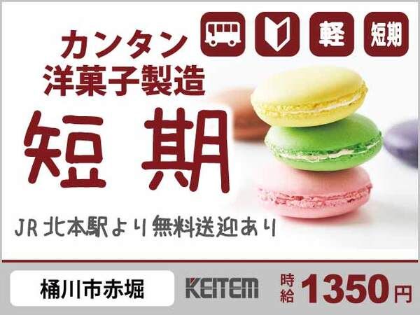 仕事内容 【お土産用お菓子の製造(原料の投入・検品など)】 有名な東京土産を製造している会社の工場でのお仕事です。 サクサクのウエハース生地でホワイトチョコレートを サンドした大人気の洋菓子を製造します。 下記の作業をお願いします。 ▼作業内容 (1)コンベアで流れてきた製品を目視にて検品し、 割れや欠け等がある製品を除去したり手直ししたりする (2)バターや粉等の原料を機械に投入する (3)流れてきた製品を箱に詰める 【求人担当者からヒトコト】 各々の適性に応じて配属先が決定します。 どの作業も未経験からすぐに活躍できる カンタン作業です。 ・。'.・。'.・。'.・。'.・。'.・。'.・。'.・。 ◆ おすすめポイント ◆  ̄ ̄ ̄ ̄ ̄ ̄ ̄ ̄ ̄ ̄ ̄ ̄ ̄ 【お土産用お菓子の製造】 『送迎バスで通勤便利!短期でお菓子作り』 #2026年3月末まで #20~50代後半活躍中 #時給1350円 #日勤 #日払い可 #シフト制 #送迎あり #原料の投入 #お菓子の検品 #社会人未経験歓迎 #車・バイク通勤OK ・。'.・。'.・。'.・。'.・。'.・。'.・。'.・。 ◆ 職場環境について ◆  ̄ ̄ ̄ ̄ ̄ ̄ ̄ ̄ ̄ ̄ ̄ ̄ ̄ ▽20代~50代のスタッフさん活躍中 未経験の方も、先輩スタッフさんや社員さんが 丁寧に作業を教えてくれるのでご安心ください。 ▽クリーンルーム内でのお仕事です チリや埃をシャットアウトした清潔な空間で、 クリーンスーツ(防塵服)を着用して作業を行ないます。 ・。'.・。'.・。'.・。'.・。'.・。'.・。'.・。 ◆ 採用担当よりPR ◆  ̄ ̄ ̄ ̄ ̄ ̄ ̄ ̄ ̄ ̄ ̄ ̄ ̄ (1)残業月10時間程度と少なめでも、月収24.3万円以上可 (2)ラインを流れてくる洋菓子の検品や箱詰め作業などのシンプルワーク (3)JR「北本」駅より無料送迎バスが運行中 ・。'.・。'.・。'.・。'.・。'.・。'.・。'.・。 ◆ 業界未経験者大歓迎 ◆  ̄ ̄ ̄ ̄ ̄ ̄ ̄ ̄ ̄ ̄ ̄ ̄ ̄ 以下の業界での勤務経験のある方も活躍中! ・自動車整備業界 ・物流・運輸業界 ・飲食業界 ・小売業界 ・サービス業界 ・アミューズメント業界 ・インフラ業界 ・ホテル業界 etc. ・。'.・。'.・。'.・。'.・。'.・。'.・。'.・。