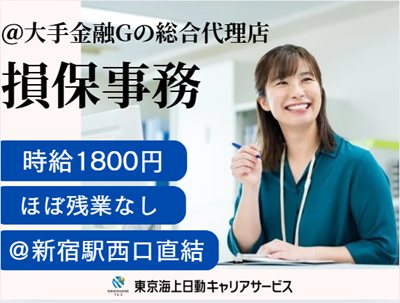仕事の内容 \自動車保険のご経験あればOK/ ◆職域×更改・保全メイン ◆ほぼ残業なし!ワークライフバランス◎ ◆ゆくゆく直接雇用の可能性も…! 【基本情報】 雇用形態:派遣社員 雇用期間:長期(3カ月以上) └1月~開始日相談可能 就業時間:8:40~17:10(休憩60分) 【必須条件】 ◆損保代理店での保険実務のご経験がある方 ◆パソコン:基本操作(入力~修正) 【お仕事内容】 団体扱いの自動車、火災保険を中心とした更改業務 ・異動、保全 ・照会 ・計上 など *東京海上日動多め *業務にあたり損保募集人資格が必要です 【環境面等】 ・@新宿駅西口直結/駅チカ/駅歩5分以内 ・20代・30代・40代・50代の多い職場 └幅広い年代活躍中/子育てに理解ある主婦・主夫活躍中/TCS派遣スタッフさんご活躍中 └OJTでわからないことは質問、確認をしながらオシゴトできる環境です ・ランチタイムは休憩スペース利用OK └お弁当持参OKです ・オフィスカジュアル内で服装自由 └更衣室あり 【福利厚生等】 ・社会保険完備 ・ベネフィット・ステーション ・定期健康診断あり ・禁煙オフィス!煙苦手な方も安心 ・平日のみOK!土日祝休み ・年間休日120日以上&お休み相談可 └有給休暇、年末年始休暇 ○●ご応募検討中の方へ●○ ・頑張り次第では社員登用の可能性も! 時代の変化を柔軟に取り入れながら成長できる職場です!ご応募お待ちしています! ○●嬉しいPOINTたくさん!●○ 履歴書不要!開始日相談/長期/主婦・主夫活躍中/子育てに理解のある職場/月収例25万円以上/社会保険完備/残業月5時間以内!基本定時で退勤/7.5時間以内勤務@時給1800円