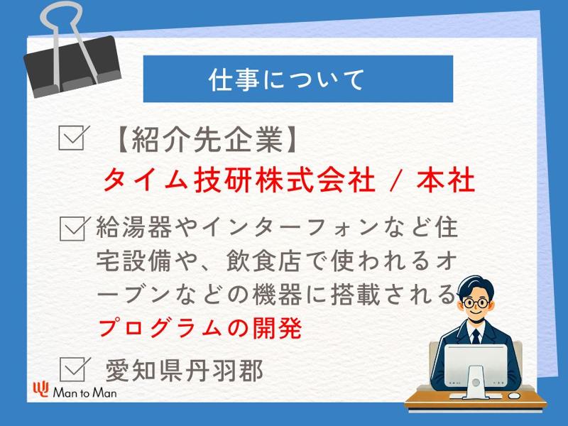 仕事内容: 【職種】 電子機器の組込み系ソフトウェア開発 【仕事内容】 【紹介先企業】 タイム技研株式会社 / 本社 【事業内容】 マイコン制御による各種電子制御基板、省人化設備について、 設計開発から製造まで行うメーカー。 ■ 家庭用ガス機器や業務用厨房器などのガス電磁弁 ■水の有無を検知する水流スイッチ、 水量を検知するフローセンサーなど各種センサー類 ■ 給湯器などにおける燃焼安全制御基板、 床暖房の温調制御基板 【業務内容】 給湯器やインターフォンなど住宅設備や、 飲食店で使われるオーブンなどの機器に 搭載されるプログラムの開発を行っていただきます。 具体的には ・お客様との打ち合わせ → 仕様検討 → ソフトウェア設計 ※ワンタッチマイコンのソフト開発業務 C言語を使用。 ソフト仕様を含めた開発業務を行います。 【おすすめポイント】 ・日勤のみ ・完全週休2日制(基本、土日。年に2回土曜出勤あり) ・家族手当あり ・役職、資格手当あり ・定年後の再雇用制度あり ・20代、30代、40代、50代活躍中 【選考スケジュール】 1. 書類選考 2. 一次面接(Web) 3. 適性検査 4. 二次面接(本社) 5. 内定