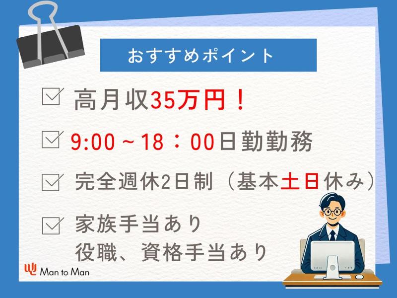 【保険制度】 雇用保険、労災保険、健康保険、厚生年金 待遇・福利厚生: 【加入保険】 健康保険,厚生年金,雇用保険,労災保険 【待遇】 ・固定残業代 90,000円~110,000円 ※残業の有無に関わらず支給。 40時間を超える場合は追加で支給 ・通勤手当(全額支給) ・家族手当 ・資格手当 5,000円~50,000円 ・役職手当 15,000円~50,000円 【喫煙環境】 屋内原則禁煙(屋外に喫煙所あり)