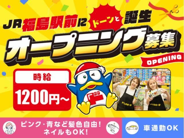 仕事情報 ● 仕事内容 売場の仕事は品出し・棚替え(ディスプレイ変更)・接客・発注・レジとか。レジは基本なので入社したらまずレジの研修を受けます!レジが混んでる時は率先してレジに入りましょう。バックヤードでは倉庫作業、PC作業など。勤務体系にもよりますがやる気のある人にはドンドン仕事を任せていきますよ♬ 福島をワクワクで埋める! 毎日に「もっと刺激が欲しい」と思ったことはありませんか?ここは、福島で新しい「ワクワク」を一緒に創る場所。オープニング110名全員が、この街を盛り上げる一期生です!駅チカなのに「駐車場完備」だから、駅前の店舗では諦めがちな「マイカー通勤」も、ここならスムーズに通えます! バイトの域を超えてる!? 仙台に行かないと買えなかったコスメやカラコンも大集結!売場がMEGAなら、任せる仕事もMEGA!「何を売るか」「どう並べるか」…推し商品を「どうバズらせるか」はあなた次第!オタク気質、派手髪、凝り性…その「個性」、ここではむしろ大歓迎。社員もバイトも経験も関係ナシ。「好き」や「こだわり」を爆発させましょう! 帽子なしで髪型を崩さない バイト終わりに鏡を見てガッカリ…なんてことはありません。エプロンを外したら、0秒で「いつもの自分」に!そのままデートや遊びへ直行できる!これがドンキ流! PPIHグループ 「ドン・キホーテ」をはじめ、売り場面積・アイテム取扱い数の大きな「MEGAド ン・キホーテ」などを展開しているPPIHグループ。「新しい驚き」や「ワクワクする楽しさ」「品質と利便性」「安全・安心」を提供し、お客様に選ばれる店づくりを目指しています。