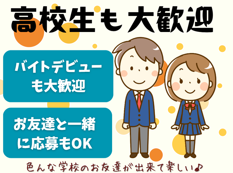 求めている人材 *長期勤務で切る方大歓迎! *家事と両立する主婦(夫)さん応援! *学校帰りに働きたい学生さん大歓迎 *フルで入れるフリーターさん歓迎! *高校生も大歓迎 *WワークOK! *シニアも応援