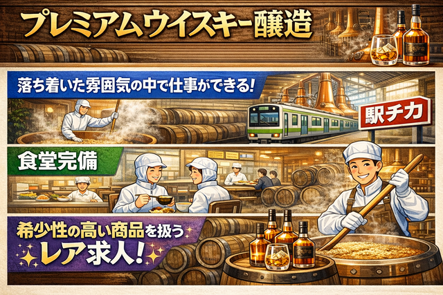 仕事内容 【仕事内容】 プレミアムウイスキーの醸造スタッフを募集します! 具体的な作業内容は… 〇お酒を造る原料の受入れ、投入作業をお任せします! ★麦芽の受入れ ・到着した原料(麦芽)を受け入れる作業 ★酵母の受入れ、投入作業 ・到着した原料をフォークリフトを使用して庫内に受け入れる作業 ・保管されている原料を指定されたタンクに投入していく ◎フォークリフトは使いますが、未経験でも資格取得支援があるので安心して活躍していただけます! ◎初めはお仕事に慣れていただきながら学んでいただくところからスタートです!ベテラン社員がしっかりサポートします! >>不安があれば面接でお話ください! 仕事内容、研修体制、待遇面など気になる点はすべて面接時に回答いたします! お気軽にお問い合わせください! *本求人は職業紹介事業者が雇用主の依頼を受け行う職業紹介求人です
