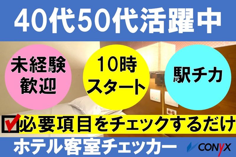 【アピールポイント】 ☆客室チェッカーさん大募集! ※チェッカーとは・・メイクさんが清掃をしたお部屋を 最終的に手直しと点検する役割です。 未経験者も大活躍中! ※同じ業種で経験を積んできた方は優遇いたします! ※体力には自信がある方もお待ちしています!