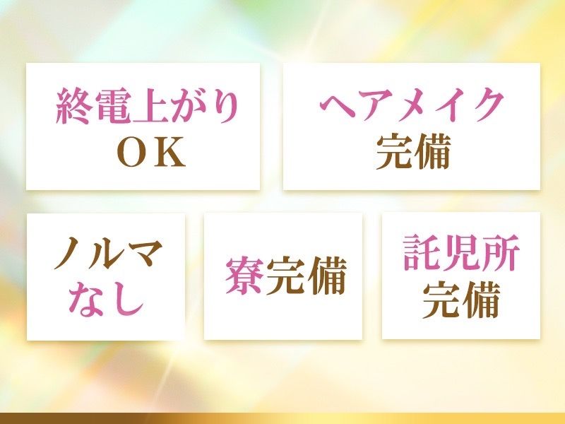 福利厚生・加入保険 【待遇・福利厚生】 ★全額日払いOK ★ヘアメイク完備 ★土日も営業! ★お酒が飲めなくても大丈夫! ★お友達と一緒に体入大歓迎! ★入店祝い金5万円プレゼント ★新規メンバーにはドレスプレゼント ★面接交通費を支給します! お気軽に面接へお越しください♪ ★【ノルマ】【キャッチ】 などはありません! お客様層も抜群です! ★最新のレンタルドレスを 多数ご用意! 無料で貸出しています! ★終電上がりOK◎ 早上がりや遅出出勤も対応OKです お気軽にご相談ください! ★ 送りとお迎えあり! 【送り】と【お迎え】両方を ご用意しています☆ 気軽にご利用ください♪ ★【寮完備】 遠方からのご応募や 一人暮らしを始めたい方 にもピッタリ! ★【託児所完備】 お子様連れのママさんも嬉しい 安心の提携託児所完備!