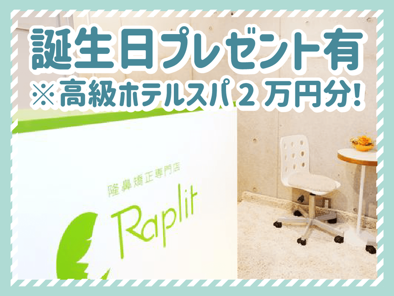 仕事内容 【雇用形態】業務委託スタッフ 【職種】鼻・小顔矯正の施術スタッフ \\メディア掲載も多数あり!// 完全予約制サロンでの施術をお任せ! 資格取得支援あり⇒安心スタート可能 *~*~*~*~*~*~*~*~*~* 手術や注射を使わず、手技だけで 鼻と小顔矯正を行う専門店です。 オールハンドでの施術をお願いします✨ ✅具体的には… ●接客 ●施術対応 ●店内清掃 ●SNS更新 …etc. *~*~*~*~*~*~*~*~*~* ⭐無料研修あり!  ̄ ̄ ̄ ̄ ̄ ̄ ̄ ̄ ̄ ̄ 日本隆鼻矯正協会認定の 「鼻矯正士」と「日本隆鼻矯正士」の 資格を取得することが可能です! 専門知識や技術など、一生ものの スキルを身につけませんか? ⭐高収入を目指せる環境!  ̄ ̄ ̄ ̄ ̄ ̄ ̄ ̄ ̄ ̄ ̄ ̄ ̄ 保障給に加えて歩合給や インセンティブなどがあるので 無理なく安定して稼げますよ♪ ⭐プライベートも充実可能◎  ̄ ̄ ̄ ̄ ̄ ̄ ̄ ̄ ̄ ̄ ̄ ̄ ̄ ̄ ̄ 完全週休3日で土日はどちらか休みなので 趣味などともしっかり両立できます! 休みも時間もお金もある、そんな 充実した生活を送ることが可能です♪ *~*~*~*~*~*~*~*~*~* <<会社情報>> ・会社名:株式会社ラプリ ・HP:https://raplit.com/ *~*~*~*~*~*~*~*~*~*