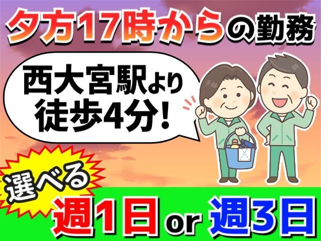 仕事内容 公共施設の清掃スタッフパート・アルバイト求人募集! 午後のみの短時間勤務なので体に無理なく働けます。 <注目ポイント> 〇未経験歓迎 〇1日3時間 〇午後のみ 〇西大宮駅より徒歩4分 〇扶養内勤務可 〇中高年・シニア活躍中 【仕事内容】 さいたま市西区西大宮にある公共施設での清掃です。 <具体的には…> ・床(カーペット)の掃除機掛け ・テーブル拭き ・各部屋のゴミ回収 など 特別な資格や経験は必要ありません。 未経験でもOK!日頃のお掃除感覚で働けます。 初めてでも先輩スタッフが丁寧に指導しますのでご安心ください。 【勤務について】 時間/17:00~20:00(実働3時間) 勤務/週1日(月曜のみ)または週3日(月・木・金)のどちらか 夕方からの勤務なので、ゆっくり準備が出来ます。 勤務日数はお気軽にご相談ください。 扶養内や短時間勤務のお仕事をお探しの方にもおススメです! 【こんな経験活かせます】 〇清掃パート・アルバイト 〇マンション清掃パート・アルバイト 〇オフィスビル清掃パート・アルバイト 〇施設清掃員パート 〇シニアパート・アルバイト 〇中高年パート・アルバイト 40代・50代・60代の中高年・シニア活躍中! 定年退職後の方、ハローワークでお仕事をお探しの方にもおススメ! ご応募お待ちしております。 まずはお気軽お問い合わせください! TEL.048-647-3800