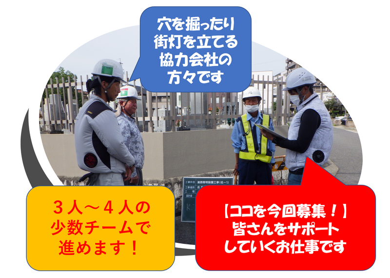 仕事の内容 ー いまのお仕事、ちゃんとお休み取れていなくて毎日バテていませんか!? →年休120日で、月収30万待遇の 「超安定職=公共設備工事の施工管理」という環境で、 安心して働きませんか(^^) ー 【年間休日120日】で働ける、『超小規模』な電気工事の施工管理(立会いとカメラ撮影メインの事務方)のお仕事です。 あなたの街にも『街灯』は、たくさんありますよね? 「電気・照明」のお仕事は、景気やコロナに左右されにくい安定した、また今後も市場が大きくなるお仕事のひとつです。当社では定着率90%以上と、長く働いているスタッフが多いのも特徴のひとつです。 施工管理のお仕事って何??・・・という方も多いと思います。 今いるスタッフほぼ全員が「業界未経験」からのスタートですが、しっかり長く働いています。あの飲食チェーン、サイゼ〇ヤの店長だった方もいます。 『なぜか?』 実は、この仕事、 作業の「立会いと、カメラ撮影」がメインなので、肉体労働は少なくて、無理なく続けていけるからなんです!更に入社から1年間は研修期間で必ず先輩社員がついてくれますので、分からない事はすぐ聞けて、自分のペースでしっかり仕事を覚えていけます。 更に、電気工事関係のお仕事は未経験からスタートした後も、キャリアアップがしやすい職種と言えます。 国家資格(まずは第二種電気工事士)を取得しながら、理想の働き方を追求できる点もオススメですよ! ー・-・- 【お仕事の概要】 名古屋市内の街灯を設置する4人チームの現場管理(施工管理)です。 主なお仕事は「作業の立会いと写真撮影」これが全体の70%位。 あと30%ほどは事務所での事務作業やお役所とのやり取りなど。 (※より細かい説明はこの下にあります) 【主なお仕事内容】 ①書類の作成 →市の方へ許可を取るための書類を作成します。(テンプレあります) ②現地調査 →市から言われた場所に設置しようと穴を掘ったら、水道管が走ってた…というケースもあります。市の方へ状況を説明して、どうするか(場所をズラすのかなど)指示を仰ぎます。 ③協力会社さんと打合せ →いつも同じ業者さん達ですので「今回もいつも通り、安全によろしくお願いしますね!」という感じ(^^)/ ④材料の手配 →街灯設置に何が必要か(例えば金属のポールやLEDライトなど)を確認して発注書に記入し、発注担当スタッフへお願いします。あとは納品を待つだけ。 ⑤期間中の立会いと写真撮影【これが主】 →作業の立会いをして、作業の経過を写真撮影します。お手伝いはまったく必要無いので、ただ立ち会う(見守る)だけでOK! ⑥竣工書類の作成 →「完了しました」という書類を作成して、市に提出します。 ⑦検査立会い →市の担当者が現地で仕上がりをチェックしますので立会います。 ー・-・- ■街灯設置は超コンパクトです。 イメージは[ 電話ボックス ]を設置する感じ。 直径2m範囲の中、3人くらいでこじんまりと作業してます。 それを少し離れた所から見守ったり写真を撮ったりするのが あなたの大事なオシゴトです(^^)/ ー・-・- ◆特徴 「忙しくない時期」と「忙しい時期」が 毎年、ほぼ決まっています。 ・4月~8月=忙しくない ・9月~3月=忙しい時期 ー・-・- 【忙しくない時期のイメージ】 08時30分:出社、朝礼 09時00分:メールチェック 09時30分:現場へ車で移動 10時00分:業者さんと現場確認 11時00分:軽微な電気工事の立会い 12時00分:ランチ休憩♪ 13時00分:施工のマンションへ移動 14時00分:共用部のLED化工事立会い 15時00分:完了状況の写真撮影など 16時00分:帰社し事務作業(週報作成・翌日準備) 17時30分:今日のお仕事終了! ※4月~8月は閑散期で、残業ゼロか、あっても15分/日くらい。 ※軽微な単発の仕事をこなす期間です。 ◆外での対応:35%、内勤の事務作業:65%です。 ー 【忙しい時期のイメージ】 08時30分:出社、朝礼 09時00分:メールチェック 09時30分:現場へ車で移動 10時00分:業者さんと打ち合わせ 11時00分:進行状況確認、立会い 12時00分:ランチ休憩♪ 13時00分:市への確認や対応 14時00分:到着した材料の個数や型番チェック 15時00分:進行状況の写真撮影など 16時00分:現場対応終えてから移動 17時00分:帰社し事務作業(写真整理・週報の作成・翌日準備) 19時30分:今日のお仕事終了! ※9月~3月は稼ぎ時の繁忙期で、残業1時間~1.5時間/日くらい。 ※秋~冬にかけてイルミネーションの設置もしています。 ※ 直行直帰の場合もあります。 出張・夜勤はありません。 ◆外での対応:70%、内勤事務仕事:30%です。 ー 【お仕事を通してこんな成長ができます】 1.資格と技術が身につく 電気工事士資格は、一生モノの資格です。道路灯や屋外施設の照明設備だけでなく、一般家庭の住宅照明やビルのイルミネーションなど、さまざまな需要・顧客があるため、幅広い技術も絶対に身につきます。(一部の資格取得時には報奨金もありますよ♪) 2.広い視野を持てる 協力会社をサポートする時には次の工程から逆算して自分のやるべきこと、スケジュールを決めてスムーズな流れを