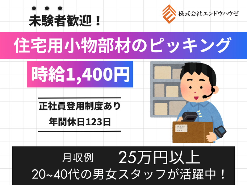 仕事内容 【アピールポイント】 * 大手住宅メーカー向けの製品を 扱っているので長期で安定して働けます * 将来を真剣に考えてる人にオススメです! 派遣先への正社員登用の可能性あり! * 土日祝休みで年間休日は123日! プライベートも充実させることができます 【仕事内容】 大手住宅メーカーの部品を製造している 工場での勤務となります ◎住宅用小物部材のピッキング◎ 棚から部品をピッキングして頂く 簡単なお仕事です 扱うものは小さくて軽いので、 安心して作業が出来ます 20代~40代の男女活躍中です! 何かご質問等ございましたら、 お気軽にご連絡ください! ■急募