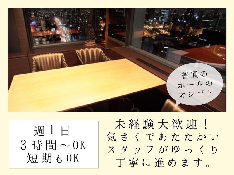 仕事内容 当店はレストランですので、 同席して一緒にお酒を飲む事や、 営業、接待、写真撮影、連絡先交換など、 一切ありません! ★━━━━━━━━┓ ┃ ホールスタッフ ┃ ┗━━━━━━━━★ バニーガールの制服で、 ✅お客様のご案内 ✅オーダーをお聞きする ✅お料理の提供 など、レストランでの ホール業務をゆっくりでいいので、お願いします✨ 仕事内容は、 普通のホール業務のみですので、 安心して働いて頂けます⭐ 未経験の方、大歓迎! アルバイトデビューを応援します✨ 気さくで温かいスタッフが、 ゆっくり丁寧にお仕事を進めますので、 未経験でも安心です⭐ お客様はファミリーや経営者、落ち着いた方ばかりで、 お料理やワインを楽しむお客様が来店されます。 仕事内容を、 親兄弟や友達、パートナーの方に話しているスタッフも多く、 安心な職場なので心置きなく のびのび働いています⭐ 働きやすい環境作りに力を入れています✨ 3月より、 特別募集を開始します! ★━━━━━━━━━━┓ ┃ どんなレストラン? ┃ ┗━━━━━━━━━━★ 大阪を一望できるビル32階、 抜群のロケーションにある スタイリッシュな正統派、会員制レストランです⭐ 料理はフランス料理やステーキ、洋食等をご用意していますが、 敷居は全然高くなく、 温かい雰囲気で働きやすい環境です✨ ※当店はキャバクラやクラブ、ガールズバーでは 一切ございません。 ※当店はスタッフがお客様と一緒にお酒を飲むなど、 一切ございません。 ✅当店はレストランでございます。 ★━━━━━━━━━━━━━┓ ┃ シフトの融通はバッチリ! ┃ ┗━━━━━━━━━━━━━★ 週1日~、1日3時間~OK⭐ シフトの融通もバッチリでプライベート充実します♫₊⁺ 18時~や19時~、20時~勤務も大歓迎✨ 授業や試験、昼間の仕事とのシフトの融通も抜群⭐ ご希望をぜひ♫₊⁺ ・午後のみでOK ・選べる時間や曜日 ・短時間勤務OK Wワークも、もちろん歓迎♫₊⁺ 扶養内勤務も歓迎します✨ 学生の方、Wワークの方、大歓迎です⭐ 面接時、履歴書不要で、 清潔感があれば、 髪型、髪色自由、 ピアス、ネイルもOK✨ ★━━━━━━┓ ┃ 勤務地は? ┃ ┗━━━━━━★ 勤務地は人気の梅田✨ 法律事務所やテレビ局の支社、会計事務所などのオフィス、 大学やクリニック、カフェ、サロン等も入っている スタイリッシュなビルの32階にあります⭐ アルバイトの前後に買い物やカフェなんかも ゆっくり満喫できる環境です✨ 温かい雰囲気のお店で、気さくなスタッフが多く、 人間関係に悩まない、スタッフの働きやすさを第1に考えたレストランです⭐ 『働いてみたら、想像よりもとても良かった♫₊⁺』 との声も多いアルバイト内容です✨ 落ち着いたお客様が多く、 ゆっくりとした時間の流れる美味なレストランで、 アルバイトを始めませんか⭐