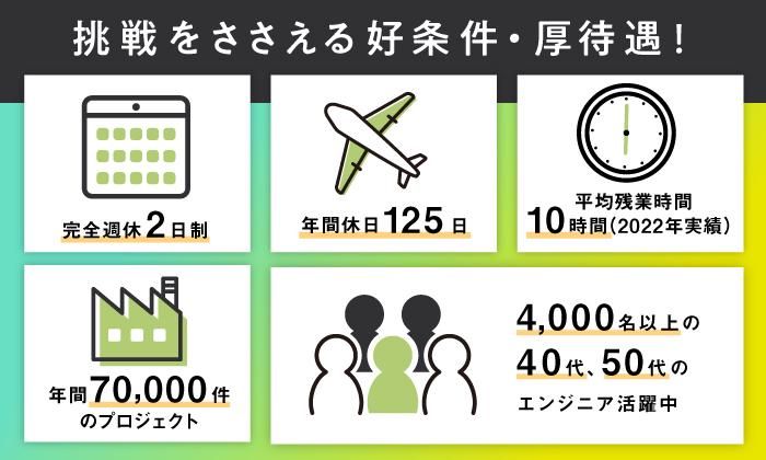 仕事内容 ///// 働きやすい環境 ///// ・週休2日制 ・年間休日125日 ・平均残業月9時間(2024年度実績) で安心感抜群。 ・年間80,000件のプロジェクト ・約18,000名の仲間 ・全国の勤務地 経験を活かせるプロジェクトでエンジニアとしての腕を発揮してください。 「大切なのは好奇心。 50歳から新分野へ挑戦できました」 エンジニアとして携帯電話の開発に、 黎明期から長年携わってきました。 ただ、50歳を前に 新しい分野に挑戦をしたいと転職を決意。 立ち止まらずに挑戦できたのは、 プロジェクトが豊富に揃っていて、 エンジニア一人ひとりに寄り添ってくれる スタッフサービス・エンジニアリングの サポートのおかげです。 いくつになっても好奇心さえあれば、 新しいことに挑戦することはできます。 もしあなたもエンジニアとして 活躍しつづけたいなら、 ぜひ一度、相談してみて下さい。 * 初めまして、私はいま、 スタッフサービス・エンジニアリングで エンジニアをしています。 高校卒業後に就いた仕事は自衛官。 航空無線の検査・修理を任されました。 数年後、日本はバブル景気に突入。 その頃に出始めたのが携帯電話でした。 当時、通信の最先端だった携帯に携わりたい! 好奇心の向くままに 大手電子機器メーカーへ転職。 携帯が急速に普及していくのを、 近くで見ながら情熱を注ぎ続ける日々。 大変でしたが、楽しい時間でした! 一方で、50歳を前にやり切った感もあり、 新しい挑戦をしたくなった。 その挑戦を支えてくれたのが、 スタッフサービス・エンジニアリングです。 今は大手メーカーで メガソーラー発電所の開発に プロジェクトマネージャーとして 携わっています。 色々な分野のプロジェクトの中から、 興味の持てる仕事を用意してくれる。 エンジニアとしての好奇心が 刺激される最高の環境です。 ///// 仕事内容 ///// 家電、自動車、ロボット等の機械設計・回路設計・生産技術・品質保証など。経験活かせるプロジェクトへ就業 【具体的には】 全国のメーカーから集まる年間80,000件ものプロジェクトがあります。 スキルやご経験に応じて機械設計・回路設計・生産技術・品質保証などの業務に関わっていただきます。 【仕事例】 ・プロジェクターの構造設計 ・自動車の衝突性能開発、CAE解析 ・発電プラント機器のCAD設計 ・医療用カメラの回路設計 ・航空機部品の品質管理 ・半導体前工程の生産技術 ・工場内IoT技術活用検討・設備導入 幅広い製品分野の豊富なプロジェクトから、あなたに最適なポジションをご提案します。 ご希望があればぜひご相談ください。