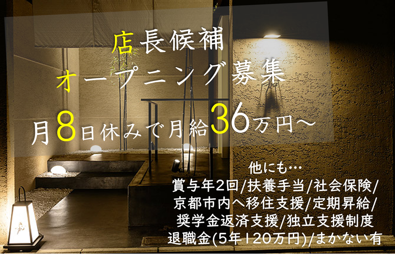 仕事内容 ◆5店舗目オープン!オープニング募集◆ ★炭火と京都の食材を使った焼肉店★ お客様が肉を食べ終えるその瞬間まで、 心に印象を与えられるよう配慮。 おしゃれな空間で非日常な雰囲気を 演出し「手の届く贅沢」をテーマに 現在京都市内で5つの高級焼肉店を 運営しています。5月に5店舗目が 新規オープン!今年の秋にはさらに 新店をオープン予定!2029年までに 10店舗への拡大を目指しています。 また、同じ「手の届く贅沢」を コンセプトにしたリゾートヴィラの経営も スタートし、既に予約が半年待ちなど 順調に事業を拡大しています。 「kinoe」ならではの高級焼肉体験で より多くのお客様に笑顔に なっていただける体制を整えるため、 将来的には副店長・店長・マネージャー・ 独立・取締役などのポジションで 活躍していただける新しい仲間を募集! 事業拡大の計画があり、 続々と新規出店していくので、 「なかなか店長になれない」なんて 悔しい思いをすることはありません。 「京都焼肉と言えばkinoe」と 広く認知されるブランドを、共に 創り上げていける方をお待ちしています。 ◆収入と休みのバランスに配慮◆ 「ライフスタイルに喜びを」という理念を 実現するため、収入だけでなく 勤務時間や休日にも配慮しています。 業界全体の長時間労働×低賃金という課題に 取り組み、ワークライフバランスに満足できる 働きやすい企業を目指しています。 趣味や家族との時間を大切にしたい方なら 「月10日休み・年間休日120日」 収入アップ・スキルアップを重視する方なら 「月6日休み・月給34万円」など あなたらしい働き方を選んでいただけます。 ◆未経験の方歓迎◆ ホールでの接客業務や キッチンでの調理業務など、 店舗業務の基本から丁寧に教えます。 お客様への言葉遣い・話し方や 包丁の持ち方など、 全然自信がなくても大丈夫! 個人の成長が、収入や将来の選択肢を 増やすことにつながり、一人一人の 豊かなライフスタイルを実現できると 考えています。そのため、学びと経験の場を 積極的に提供!お客様を第一に考え、 仲間を大切にできる方なら大歓迎。 当社での仕事を通じて、あなたが本当に やりたいことを見つけてみませんか? ◆自分たちの声が、働きやすさに◆ 30代の社長の下、20代・30代の若手が 中心となって活躍しています。 全員が気軽に意見を言える風土を 大切にしているので、自分たちで より働きやすい環境を作っていけます。 基準が明確な評価制度をはじめ、 多数の福利厚生を新たに導入しました。 ◎引越し手当/店舗近くへの引越し費用を 最大30万円まで規定支給 ◎奨学金補助制度/月1万円まで会社負担 ◎まかない/営業前後の食事で食費を節約 ◎独立制度/費用は全額当社負担で出店可能 固定給+インセンティブで 年収1000万円を目指せます。