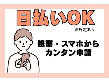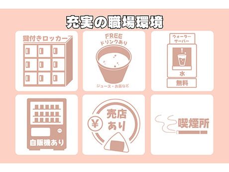 【保険制度】 雇用保険、労災保険 待遇・福利厚生 【福利厚生】 ・雇用保険、労災保険あり ※加入要件を満たす場合は 健康保険、厚生年金あり(法令による) ・交通費支給(2450円/日) ・日払い制度有(規定あり) ・研修制度あり ・残業手当あり ・服装/髪色自由(規定あり) ・車、自転車通勤OK (無料駐車場・無料駐輪場あり) ・休憩室 ・喫煙所 ・鍵付きロッカー ・ウォーターサーバー ・フリードリンク(スープ、ジュース、お茶など) ・自動販売機 ・売店あり ・お弁当持参OK (保管用冷蔵庫、電子レンジ、給湯ポット)