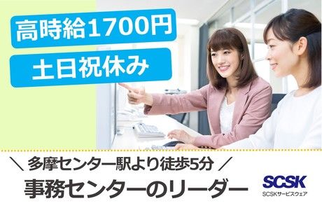 仕事内容 \\ おすすめPOINT // ◎土日祝休み ◎時給1700円+交通費全額支給 ◎多摩市/多摩センター駅より徒歩5分<駅チカ> ――――――――― ◆ お仕事内容 ◆ ――――――――― 有名ネット銀行の事務センター/リーダー まずは通常業務の習得からスタートし、 その後、リーダー業務をお任せします。 【センターのお仕事は】 ・書類確認、不備チェック ・データ入力、照合作業 ・送付物の作成、発送準備等 ・関係者との連絡業務(メール・電話) 【リーダーのお仕事は】 ・業務の進捗管理 ・資料作成、クライアントとの連携業務等 事務作業がメインのセンターです。 電話対応は、1日数件程度と少なめです。 お仕事に必要な知識は、研修でしっかり学べます。 チームでお仕事をすることが好きな方、ぜひリーダーにチャレンジしてみませんか。 <業務内容>変更の範囲 会社の定める業務内容 \\ 研修内容 // お仕事に必要な知識は、研修でしっかり学べます。 まずは座学からスタートし、OJTで進めます。 徐々に対応範囲を広げ、業務習得していただきます。 \\ 採用担当より // 通勤ラクラクな多摩市/多摩センターでの勤務となります。 駅周辺には有名チェーン店や飲食店が充実、 かわいいキャラがたくさんの、あの有名テーマパークの隣です。 配属先は約10名が就業中、30~40代の女性が多めです。 ロッカーやリフレッシュルーム完備のオフィス環境。 服装はカジュアルOK、髪色自由でネイル・ピアスもOKです。