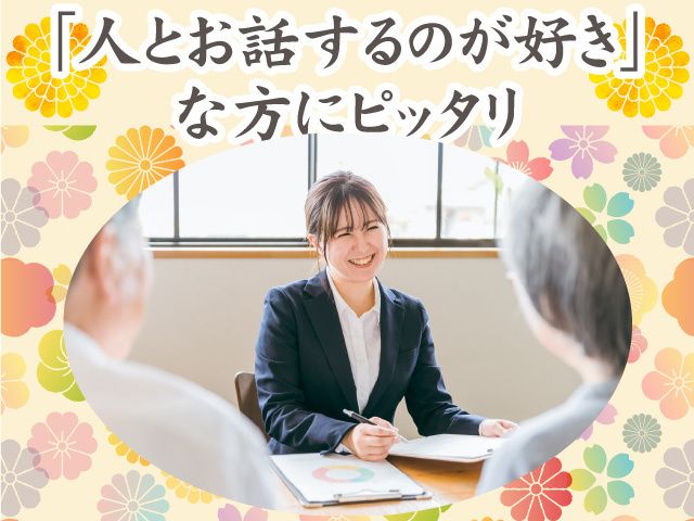 仕事内容 未経験でも正社員採用します! 基本的に残業はなく、 休みも週休2日制(日・平日休み)です。 17時に帰るスタッフがほとんどです。 未経験でも頑張り次第では、 幹部候補へとステップアップができます! 月給282,000円のスタートです。 お葬式の準備をしたい、就活の相談、 結婚式を予定しているなど人生のライフイベントに 対して弊社のサービスの案内を行います。 式場のご案内や互助会への入会案内、 お客様が安心して式を行えるように、 お客様のサポートをしていきます。 研修は2ヶ月あるので安心してスタート可能です! 冠婚葬祭アドバイザー・案内責任者 の業務をどちらとも経験をしていただきます。 マニュアルはもちろん、先輩と一緒に行動しながら、 一つひとつ仕事を覚えていけるようにしています。 適性を見て冠婚葬祭アドバイザーまたは 案内責任者を選んでもらいます。