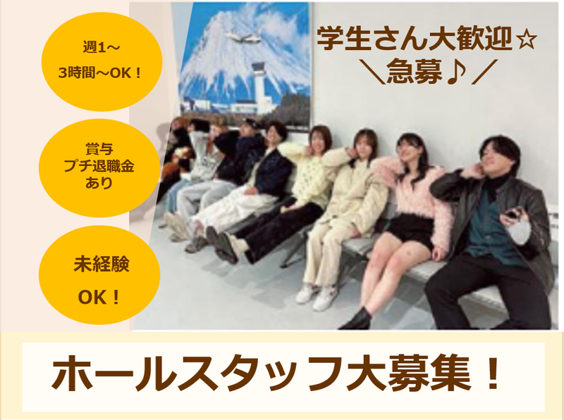 職場環境 学生さんメインにメンバーが元気よく働いています! 店舗毎の業績に応じてボーナスもある為、 意欲的に仕事してくれています。 楽しさだけではなく、社会に出ていくうえで 成長できる環境かどうかも店長は考えています! 喫煙所:喫煙所あり(屋外)