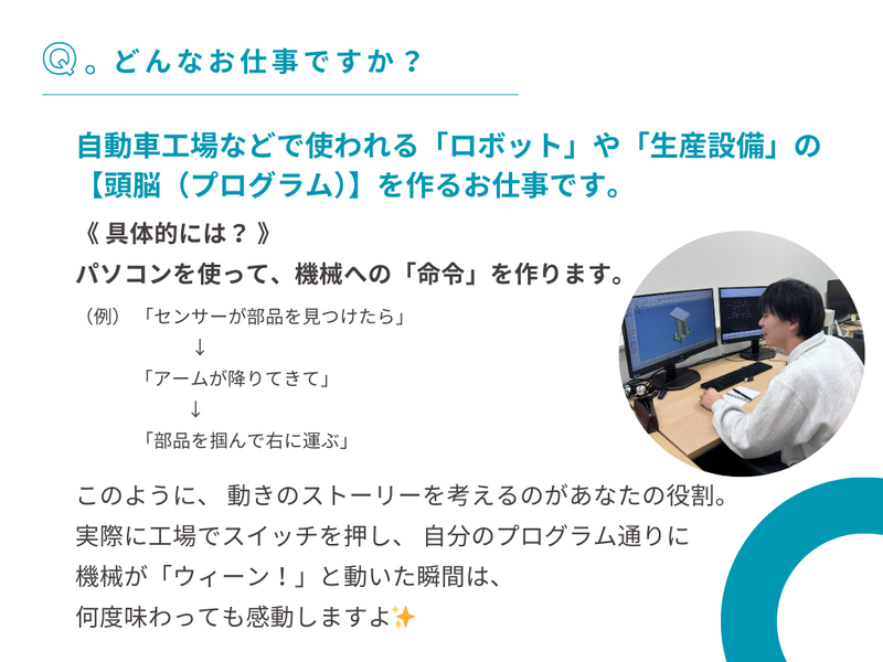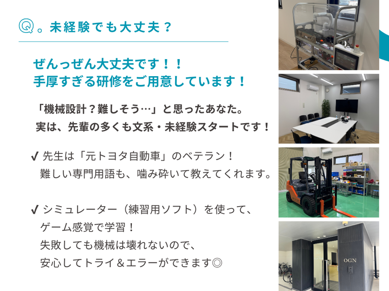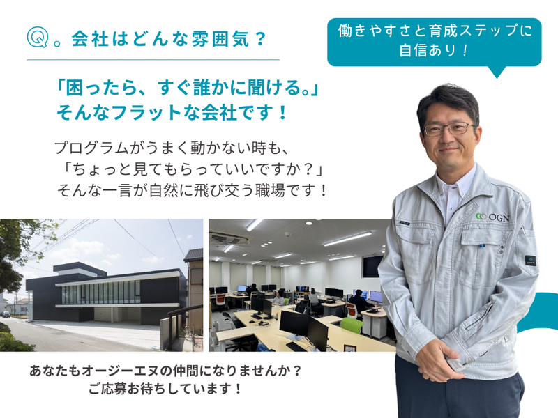 仕事内容 \✨数字で見る!オージーエヌの凄さ✨/ ✅ 年間休日121日(長期連休 年3回!) ✅ 賞与実績 3.5~5ヶ月分(たっぷり還元) ✅ 男性育休取得率 90%超(取りやすさ◎) 「パソコンを使う仕事に憧れる」 「でも、ずっと座りっぱなしは退屈かも…」 そんなあなたにピッタリなのが、 【ロボットに「動き」を教えるエンジニア】です! ===⭐ 選ばれる3つの理由 ⭐=== 【1】文系・未経験から「手に職」! 実は「パズル」みたいで面白い!?  ̄ ̄ ̄ ̄ ̄ ̄ ̄ ̄ ̄ ̄ ̄ ̄ ̄ ̄ ̄ ̄ ̄ ̄ ̄ 「電気制御」と聞くと難しそうですが、 やることは「機械が動く順番を決めること」。 難しい英語のコードをガリガリ書くのではなく、 パズルのように命令ブロックを組み合わせて 「Aのボタンを押したら、Bのアームが動く」 というルールを作っていくお仕事です。 ✔ 先生は「元トヨタ自動車」のベテラン! 難しい専門用語も、噛み砕いて教えてくれます。 ✔ 2025年12月、新研修施設OPEN!✨ まるで学校のような新オフィスで、 同期と一緒にイチから学べます。 シミュレーター(練習用ソフト)を使って、 ゲーム感覚で学習。 失敗しても機械は壊れないので、 安心してトライ&エラーができます◎ 【2】「休みすぎ?」くらいが丁度いい。 9連休×年3回で人生を謳歌!  ̄ ̄ ̄ ̄ ̄ ̄ ̄ ̄ ̄ ̄ ̄ ̄ ̄ ̄ ̄ ̄ ̄ ̄ ̄ ̄ 「仕事だけの人生」は卒業しましょう。 GW・夏季・年末年始は、それぞれ【9連休】! ✔ オフシーズンに格安旅行へ 有休もとりやすいので、 平日ゴルフや混雑を避けた旅行も思いのまま。 ✔ 男性の育休取得率90%超! 「制度があるだけ」ではありません。 役職者も取得しており、 ライフステージが変わっても長く働ける環境です。 【3】給与も、将来性も、諦めない。 賞与しっかり&AI技術にも挑戦!  ̄ ̄ ̄ ̄ ̄ ̄ ̄ ̄ ̄ ̄ ̄ ̄ ̄ ̄ ̄ ̄ ̄ ̄ ̄ ✔ 賞与年3回(昨年度3.5~5ヶ月分) 頑張りはしっかり還元。 「念願のマイカーを買った」 「奨学金を完済できた」という若手社員も多数! ★会社が奨学金返済を一部補助する制度もあります! ✔ 最先端技術に触れる トヨタグループとの取引や、 AIベンチャーとの共同研究など、 業界最先端のプロジェクトが動いています。 古い体質の会社ではありません。 ■ 実際のお仕事内容は… あなたの指示で、巨大な機械が動き出す! ┈┈┈┈┈┈┈┈┈┈┈┈┈┈┈┈┈┈┈┈•• 自動車工場などで使われる「ロボット」や「生産設備」の 【頭脳(プログラム)】を作るお仕事です。 《 具体的には? 》 パソコンを使って、機械への「命令」を作ります。 (例) 「センサーが部品を見つけたら」 ↓ 「アームが降りてきて」 ↓ 「部品を掴んで右に運ぶ」 このように、 動きのストーリーを考えるのがあなたの役割。 実際に工場でスイッチを押し、 自分のプログラム通りに 機械が「ウィーン!」と動いた瞬間は、 何度味わっても感動しますよ✨ 《 入社後の流れ 》 ▼STEP1:基礎研修(電気の基礎、図面の見方など) ▼STEP2:シミュレーション研修(PC上で動かす練習) ▼STEP3:実機研修(実際の機械を動かしてみる) ▼STEP4:先輩のアシスタントから現場デビュー! ■ オージーエヌについて ~日本のものづくりに、次の力を~ ┈┈┈┈┈┈┈┈┈┈┈┈┈┈┈┈┈┈•• 私たちは、 トヨタグループや大手電動工具メーカーなど、 日本を代表する企業から頼られる「設計のプロ集団」です。 ただ図面を描くだけではありません。 今、注力しているのは「AI × 設計」。 株式会社令和AIとの共同研究により、 設計業務に生成AIを取り入れる最先端のプロジェクトを進めています。 「安定企業で働きたい」 「でも、新しいことにも挑戦したい」 そんな欲張りな願い、当社なら両方叶います。 新しく完成する研修センターで、 あなたも「一生モノの技術」を手に入れませんか?