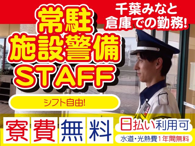 仕事内容 日払いOK! "JOBPAY"対応で急な出費も安心! 当社は"JOBPAY"に対応しているので、働いた分のお給料を自分のタイミングでGET可能 入社後に支給される「ジョブペイカード」を使えば、 コンビニ・駅・銀行ATMから24時間いつでも引き出せます! ※当日勤務分は翌日にお支払い可能(規定あり) ※詳しくは面接時にお問い合わせください! シニア世代も活躍中! 異業種からの転職多数!年齢を気にせず活躍できます。 シフトの融通◎ 希望に合わせてシフト調整OK!無理なく続けられる働き方が可能です。 資格取得支援など厚待遇◎ 警備デビュー歓迎! 研修などのサポート充実!! 【具体的には…】 千葉みなとの倉庫で、施設警備スタッフを募集しています。 守衛室での出入り管理や巡回業務が中心で、自由な雰囲気の現場です。 夜勤・当務どちらもできる方を求めています。 責任感が強く、まじめに業務に取り組める方にぴったりな職場です。 安定して長く働ける環境で、シニア世代も活躍中です。 【未経験者大歓迎】 経験・知識・技能は不問! 販売員・建設業・事務職など、異業種からの転職者も多数! 若手からシニアまで幅広い世代が活躍しています。 年代問わず始められ、安心して働ける環境が当社には整っています。 【会社、そして人がいいから働きやすい】 各種手当が充実しており、頑張りが認めてもらえる環境です。 ・将来的には正社員を目指したい! ・もっと自由に自分のペースで働きたい! ・駅チカ、自宅の近所など希望の勤務地働きたい! ・安定を手に入れたい そんな声にもしっかりお応えできます。 ぜひご応募ください! 【資格取得奨励制度あり】 ・自衛消防技術試験 ・防災センター要員講習・自衛消防業務講習 ・上級救命講習 など警備業で重要な資格をはじめ、 多彩な国家資格・民間資格の受験費を会社が負担。 資格を取得された後は、資格取得手当を支給します。 【共栄セキュリティーサービス株式会社について】 1985年設立。東証スタンダード市場上場。 長年の経験と実績で厚い信頼をいただいており、 景気に左右されない事業基盤が整っています。 商業施設や駐車場、そして工事現場etc… 当社の警備員は、あなたの街の身近な場所、暮らしの安全を支える1人として、 今日も多くの場所で活躍しています。