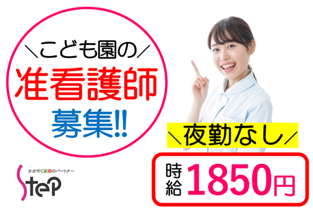 ◆月収目安26万円◆ 嬉しい高時給! 土日祝休み♪ 17時に定時退社できます☆ 夜勤なし! 株式会社ステップグランドスタッフ 認定こども園の准看護師 . ■案件NO,15857■お電話で案件番号をお伝えください! *:;;;:*:;;;:**:;;;:*:;;;:**:;;;:*:;;;:**:;;;:*:;;;:* 認定こども園の准看護師の求人案件です♪ *:;;;:*:;;;:**:;;;:*:;;;:**:;;;:*:;;;:**:;;;:*:;;;:* 【案件のポイント!】 ◆平日のみ!土日祝休み! ◆時間固定勤務 ◆残業なし ◆夜勤はありません 資格を活かしてお仕事したいけど 夜勤をするのが難しい方にぴったり! シフト勤務はなく、時間固定勤務なので 予定がたてやすいですよ☆ 土日祝はしっかり休みなので メリハリをつけてお仕事できます! 高時給でしっかり収入を得れるのも 嬉しいポイントです! _____________ ▼こんな園さんです 定員148名の認定こども園 市立の保育所から令和5年に 認定こども園になりました☆ _____________ \ステップのここが嬉しい/ 園への見学時、同行します☆ 働く上で園へ伝えておきたいこと、 時間の相談などなど ご自身では伝えにくいことも コーディネーターが伝えますので 見学時も安心です♪ 事前に園の雰囲気を知ってから 入職に繋げることができるのも 嬉しいポイント! 1人で悩まなくても大丈夫! 経験と実績がある コーディネーターが あなたのお仕事開始まで 精一杯サポートします! もちろん、お仕事開始後も 継続的にサポートしますので ご安心ください☆ ・・・・・・・・・・・・・・ \希望登録/も受付中! 希望の条件で働けるチャンス☆ 通勤時間や、勤務時間、勤務曜日など ご希望をお聞かせいただいた上で あなたにぴったりの園さんを ご提案させていただきます♪ .