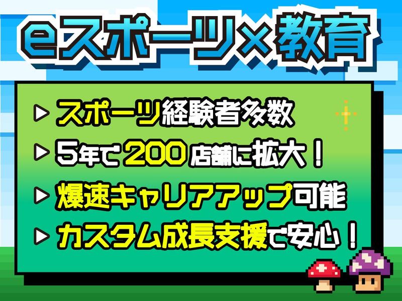 仕事内容 ?eスポーツを通じて子どもたちの成長を支える 「発表ができるようになった」「話の聞き方が上達した」──こんな感謝の声を保護者から直接いただける仕事です。eスポーツを通じて子どもたちの挨拶・マナー・発表力を確実に向上させる、他にはない教育現場。 手厚い研修制度と先輩社員による継続的なフォロー体制で、未経験からでも安心して成長できる環境をご用意しています。 ■具体的な業務 ━━━━━━━━━━━━━━━━━━━━ eスポーツを楽しみながら、子どもたちに新しい学びを提供するという他にはない教育スタイル。ゲームやプログラミングなど自分の趣味で培ってきた知識やノウハウも活かしながら働けます。発表時間には子どもたちが「おへそを向けて話を聞く」ようになるなど、成長を目の当たりにできます。 ★教室運営について PCスキルやコミュニケーション能力、問題解決力を指導するための教室です。授業は1日3コマ(1コマ1時間、1クラス10名程度)を担当し、eスポーツを通じて子どもたちに楽しく学んでもらいます。 ★指導内容 ゲームを通してPC操作やプログラミング、クリエイティブな考え方を教えることで、チームワークやリーダーシップといった子どもたちが将来必要とするスキルを身につける手助けをします。 ★イベント運営 教室対抗ゲーム大会や1泊2日の合宿など、年に4回開催するイベントの企画・運営を行います。自分のアイデアを活かしてイベントを作り上げ、生徒や保護者からの信頼を築くチャンスです! ★保護者対応 生徒の成長について保護者と定期的にコミュニケーションを取り、フィードバック。教室と家庭の二人三脚で子どもの成長をサポートしていきましょう。 【入社後の流れ】 先輩の教室へ同行し、子供たちと接するところからスタート!指導の仕方や運営方法などを学び、先輩のアシスタントとして授業に慣れてきたら担当教室が決まります。 ■仕事のやりがい ━━━━━━━━━━━━━━━━━━━━ ◎教育への使命感とリーダーシップを持つ経営陣 教育機関として、子どもたちの人間力を育む教育を実現し、急成長を実現した信頼できる経営基盤があります。教育への深い使命感と情熱を持つ経営陣のもとで、真摯に取り組むことが可能です。 ◎社内表彰制度で結果が評価される 年4回のイベント募集で、参加が難しそうな子どもに早めに声をかける、1ヶ月前から関係構築の電話をするなど、創意工夫が評価されMVPを獲得した社員も。努力した結果がしっかり認められる環境です。 ◎自分の「好き」を活かした教育 eスポーツを楽しみながら、子どもたちに新しい学びを提供するという他にはない教育スタイルなので、ゲームやプログラミングなど自分の趣味で培ってきた知識やノウハウを活かしながら働けます。 もちろんeスポーツ初心者の方も大歓迎!子どもたちが新しいスキルを習得し、チームワークやリーダーシップを身につける瞬間に立ち会いながら、自分自身も成長していけます。 ◎成長企業でキャリアもスキルもUP! イベントに授業内容など、日々自分のアイデアを反映させながら自由に教育プログラムを作り上げることができるので、創造力・提案力・計画性などあらゆるスキルを身につけられます。 頑張り次第で昇進や昇給のチャンスがあり、成果に応じて最大65万円のインセンティブも支給されるので、早い段階からキャリアアップが可能です! ■未経験も安心の研修制度 ━━━━━━━━━━━━━━━━━━━━ 開校5年目で全国200教室以上の教室を展開。異業種から転職した20代・30代が多数活躍しています!入社後1~2ヶ月の間は、教育の基本からeスポーツの指導方法、授業の進め方、教室運営などを学んでいきましょう。 ■キャリアパス ━━━━━━━━━━━━━━━━━━━━ 200教室拡大に伴い新ポジションが誕生。第二創業期だからこそ得られる、多様なキャリアやチャンスがあります。新卒・中途ともに入社2年目でエリア責任者に昇進した実例があります。