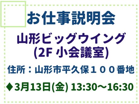 仕事内容 【軽作業】小型レンズの塗装サポート・梱包 【仕事内容】 (1)爪くらいの小さなレンズを スポイトで入れ物に移動させます (2)電子レンジみたいな専用機械に入れて 表面の色を焼き付けます ★スタートボタンを押すだけ (3)完成したら取り出して、梱包するだけ! 作業手順はすべて決まっており、 モクモク集中して進められます。 ■超軽量で身体への負担なし ■無理なく続けられます ■日勤・土日祝休み ■20代~40代の女性活躍中 【こんな方におすすめ】 ・工場勤務が初めての方 ・立ち仕事でも無理なく働きたい方 ・人と話すより作業に集中したい方 ・日勤&土日祝休みで働きたい方 ・細かい作業が好きな方 【面接会情報】 ■山形ビッグウイング(2F 小会議室) 住所:山形市平久保100番地 ・3月13日(金) 13:30~16:30